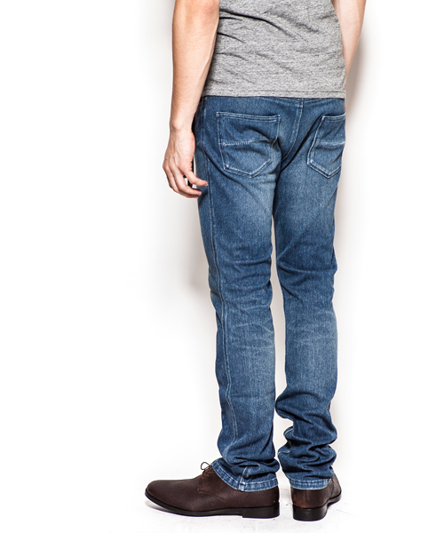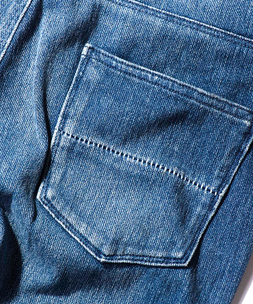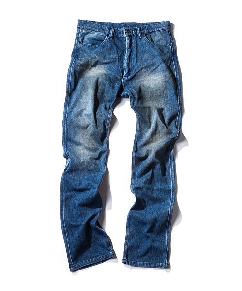 | Detail | ニットデニム生地を使用した5ポケットパンツ。ファスナーには当時の米製デットストックTALONを使用。後ろパッチポケット中心の切り替えには特殊ミシンによるハシゴステッチを施している。裾巾を微妙にテーパードさせたタイトシルエットなストレートタイプ。縫製後、デニム同様の加工を施す事で加工デニムの表情を再現。 |