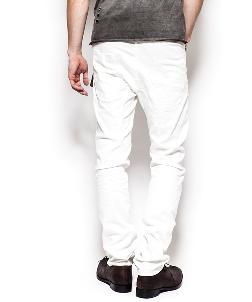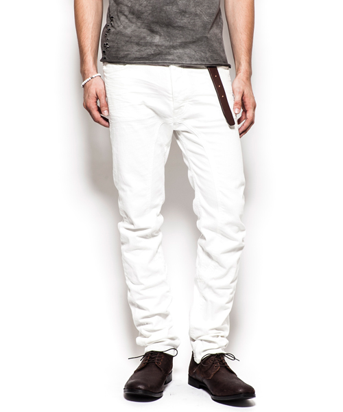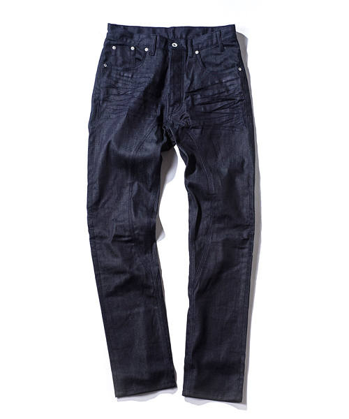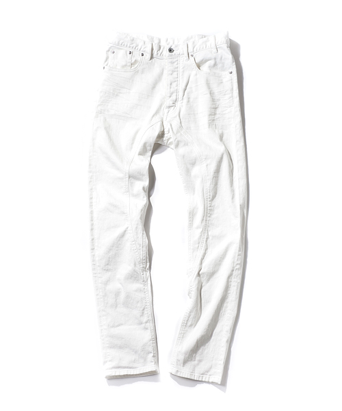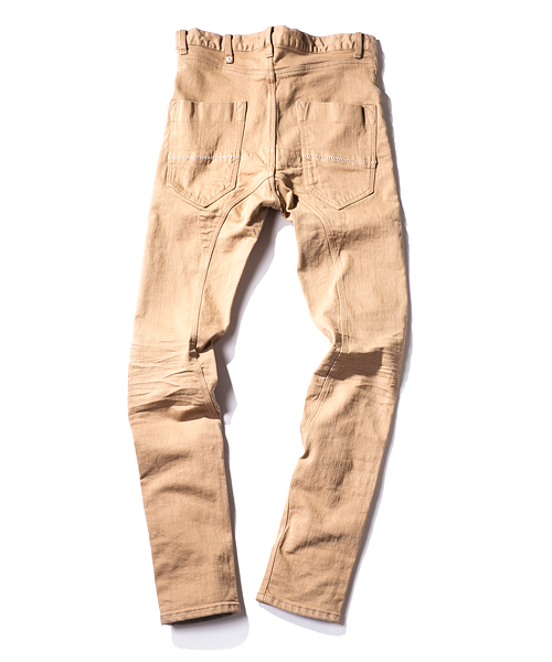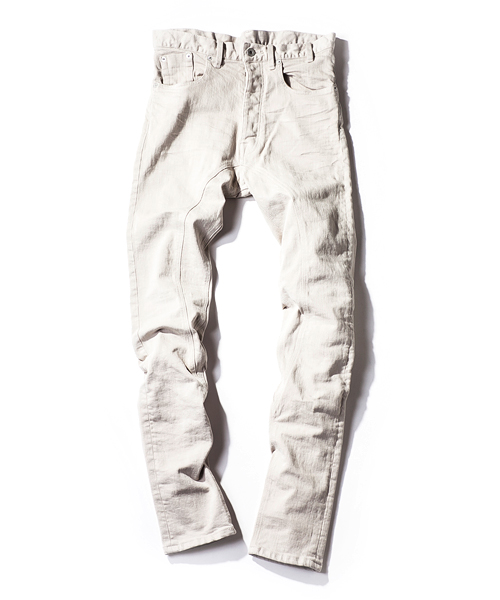 | Detail | 裾に向かって若干テーパードしたシルエット。股上は深いが、全体のシルエットが細い為、程よいルーズ感。ストレッチ素材を活かし履きやすいシルエット。番手の違うステッチで縫製する事で、加工による変化を追求した一本。 |