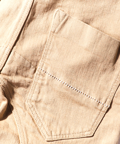| Material | セルビッチカラーデニム:一日に数十本しか生産することができない旧式の織機によって生まれるセルビッチデニムを使用したデニム。カラーデニムながらもヴィンテージデニムのような、経年変化を味わえる。 |