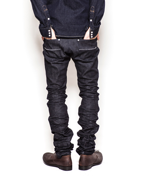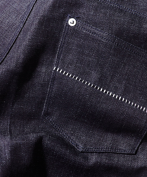 | Material | ヴィンテージストレッチデニム:アメリカで生まれたデニムは元来、糸の太さを均一にする事が技術的に出来なく様々な太さの糸での生地しか存在しなかった。現在、その頃のデニムをヴィンテージデニムと言いACANTHUSではそれを再現すべく、糸の開発から進め、今回作り上げた糸、通称「ロッキー糸」は糸の番手を通常3種類のところをさらに増やし、技術が無かった時代の生地を再現する事に成功した。いく度となく失敗して出来上がった自信も持って提供することができるデニム生地。今回使用の生地にはポリウレタンを生地の風合いを損なわないように少量配合してストレッチデニム。 |