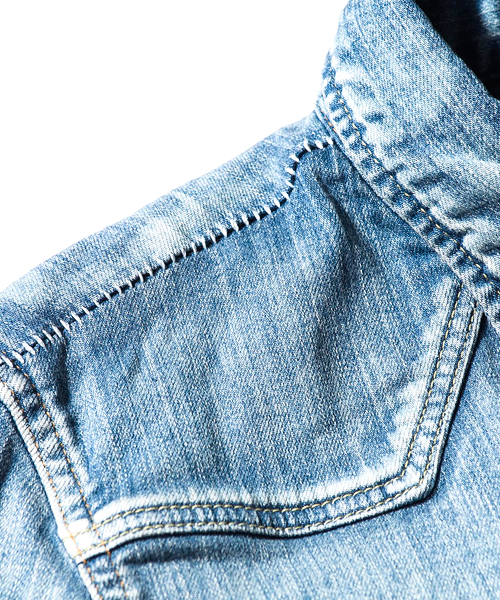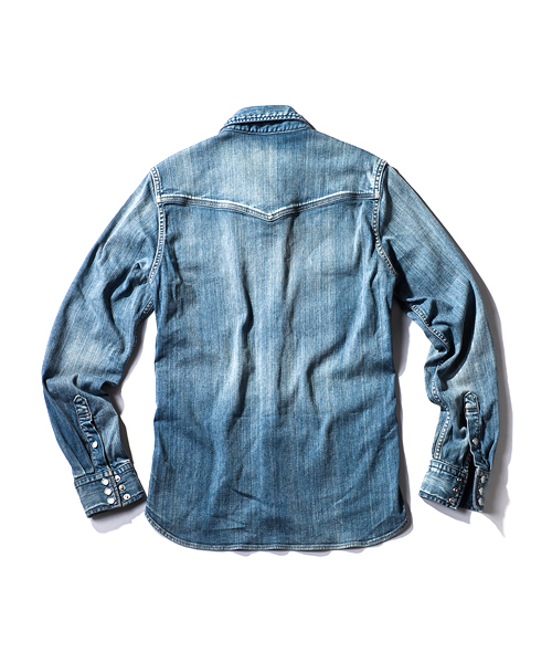 | Detail | やや細めのシルエットのウエスタンシャツ。チェーンステッチの使用に加え、異なる番手の糸で縫製をする事で、加工による表情を変化させている。前立て部分にはスエードを使用。 |
