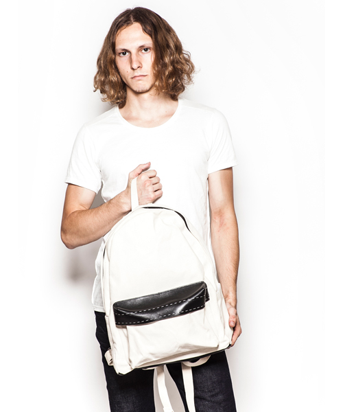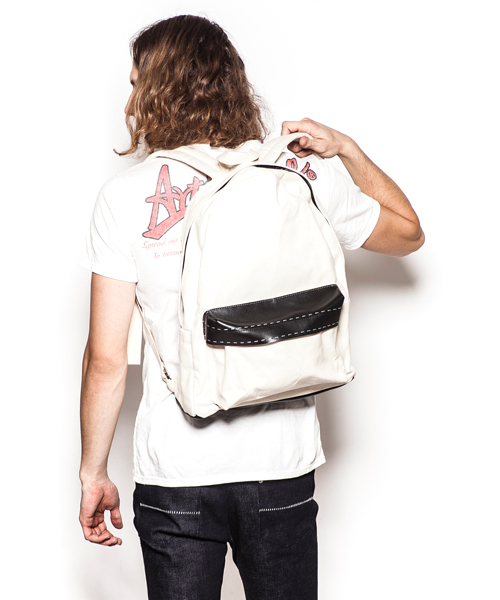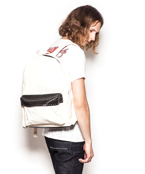 | Detail | 厚手のキャンパス生地、牛革を使用したバックバッグ。ファスナーにはTALON社製の物を使用。普段使いに最適なサイズ感を採用。内ポケットを1つ、両脇にはアウトポケットを配置。ポケットのフラップ部分の革には0番手によるハンドステッチを施している。 |