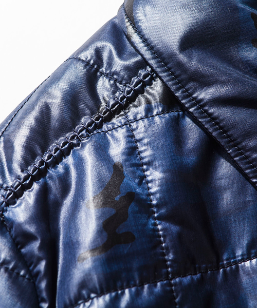 | Material | 高密度に織り上げた平織のタフタ素材。布地の裏に熱と圧力による加工を施し表地の機密性を高め光沢を出す加工方法で結果、表面がロウに似た濡れた様な独特のコーティングになり光沢のある繊維の事をシレー加工という。中でも珍しいカモフラ柄のシレー素材。 |