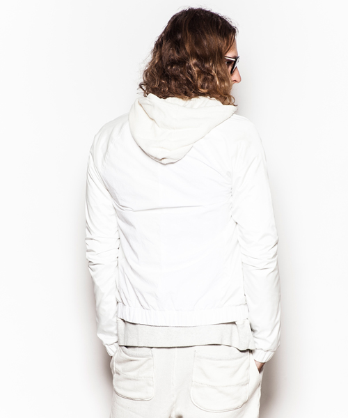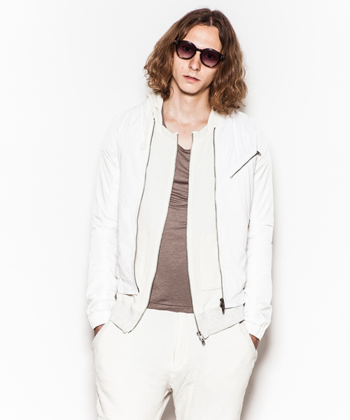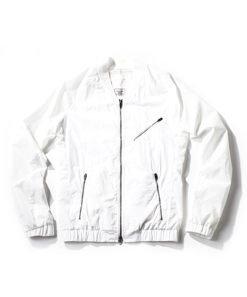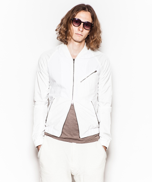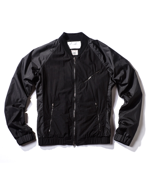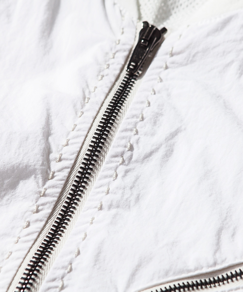 | Detail | 身頃にコットン生地、袖にポリエルテル生地にて着かえたMA-1タイプの1着。MA-1の形をベースとし、袖と裾にはゴムで絞りを入れた生地リブ仕様。ファスナーにはRACCAGNI社製の物を使用している。裏地にはCOOL MAXファブリックのメッシュ素材を使用。吸収した汗を素早く蒸発させ、体表温度を快適に保つ高機能素材。メッシュ素材なのでさらに通気性も持ち合わせている。袖はストレスの少ないラグランスリーブ仕様。フロントファスナー横には1番手の極太糸によるハンドステッチを施している。縫製後ワンウォッシュ加工を施す事で素材感の風合いをアップさせている。素材、ディテイール共に拘った1着。 |