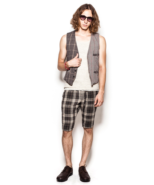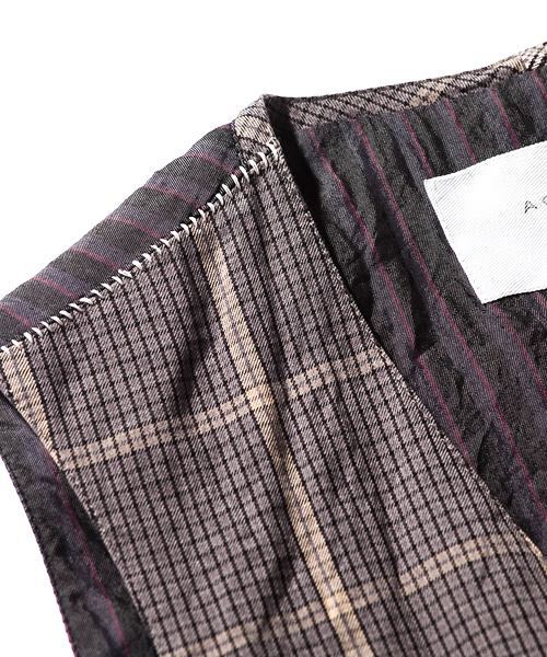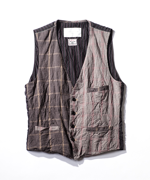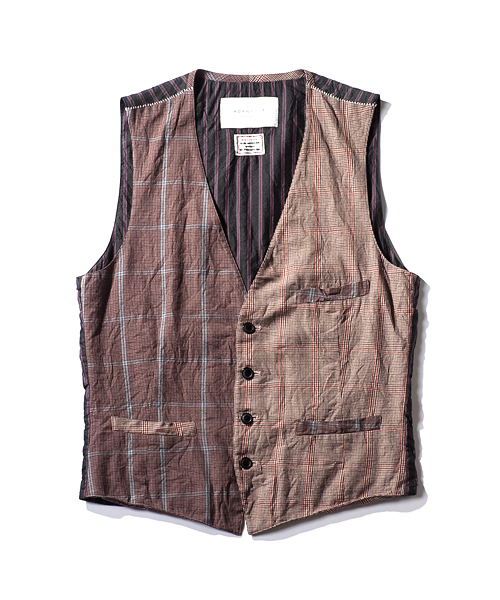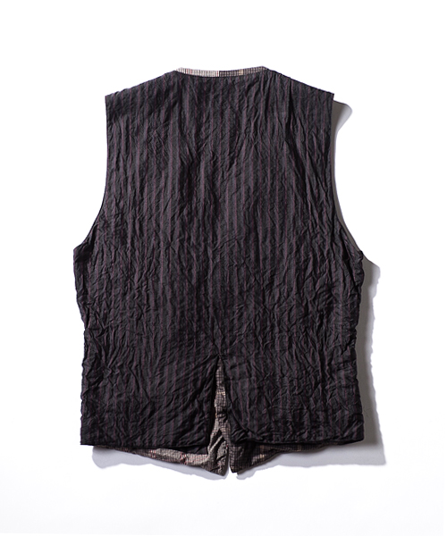 | Detail | 同生地に異なる柄、色の2種類の生地にて切り替えたベスト。フロントに箱ポケット、左身頃には内ポケットの計4ポケットを配置。釦には水牛釦を使用している。裏地にはクラシックなレジメンタルストライプ柄のコットンキュプラ素材を使用。縫製後、ワンウォッシュ加工を施しす事で全体的にシワ感を表現。カジュアルに羽織る事のできるクラシックな1着。 |