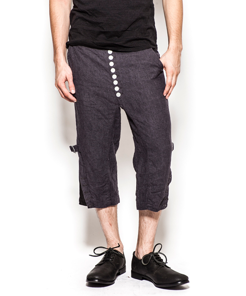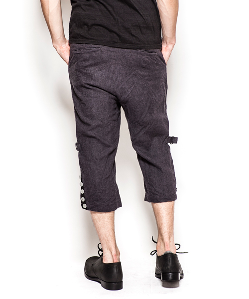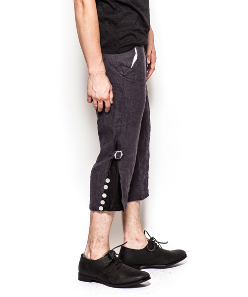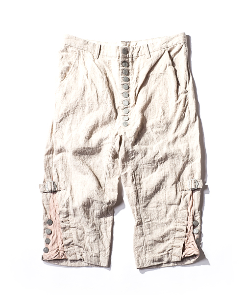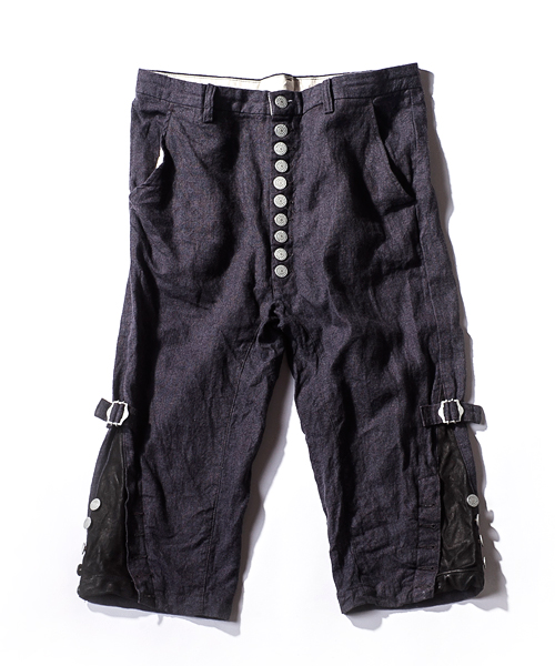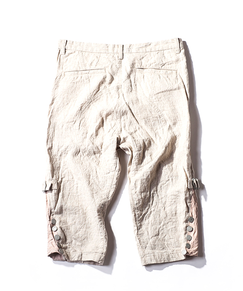 | Detail | レザー×リネンのパンツ。シルエットはジョッパータイプ。裾が絞れる使用になっており、ヌメ革が付いている。素材の経年変化により、味が深まる一本。ワンウオッシュ加工の後に天日干しする事で生地のパッカリングを出している。 |
