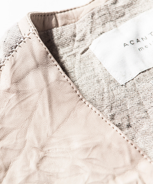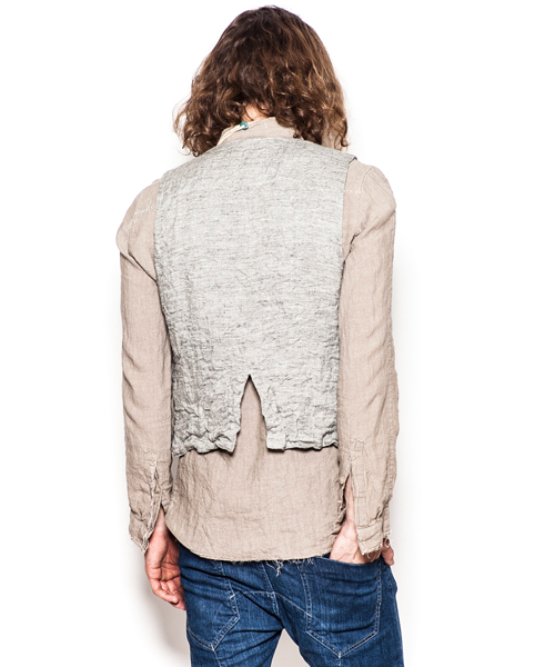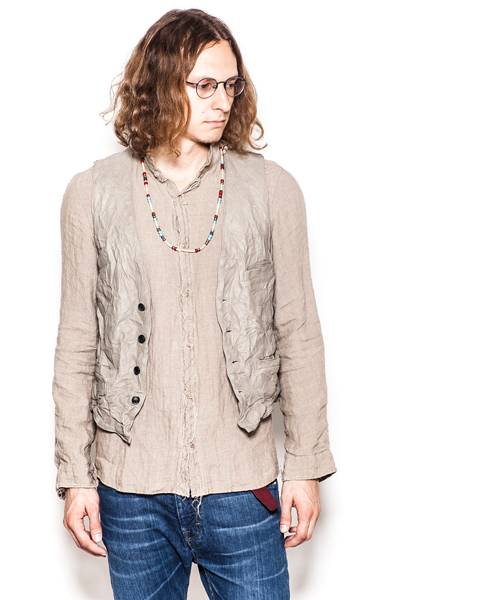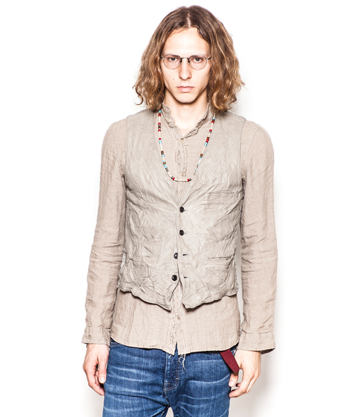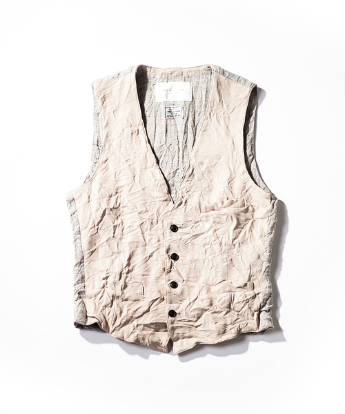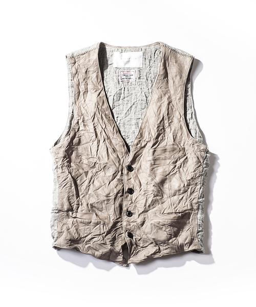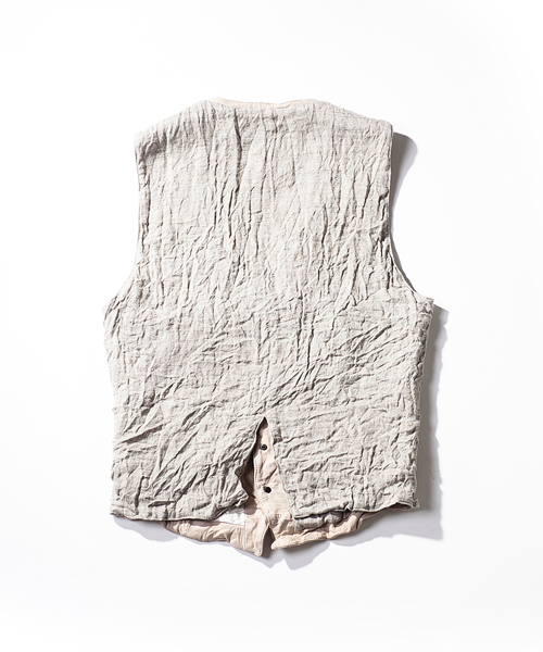 | Detail | 上質な肌触りのラムエントロフィーノを使用した贅沢な1着。ディテールはフロントに3つのポケットを配置した、5つ釦のジレを原型としている。釦には本水牛釦を使用。裏地には職人による天然染め、ヴィンテージウォッシュをかけたリネン生地を使用している。肩の接ぎ部分には縫製職人のハンドステッチによるハシゴステッチを施している。さらにこのベストは縫製後、シワ加工を施して表情を追加している。上質な表情の為、加工を施す事が稀な素材を惜しげも無くシワ加工を施した1品。 |
