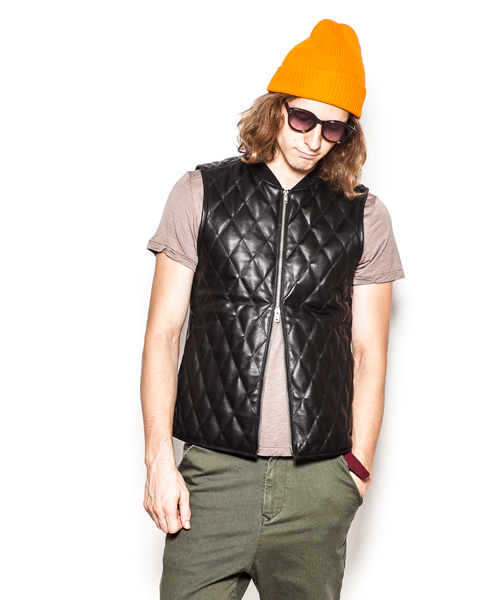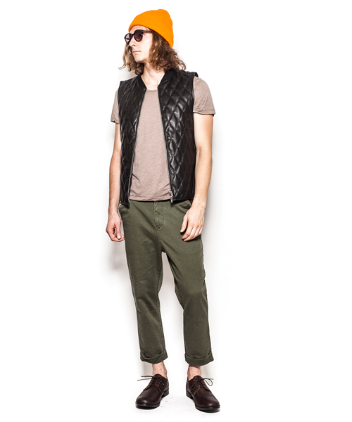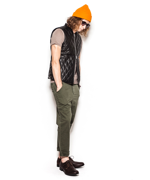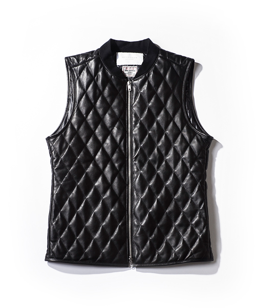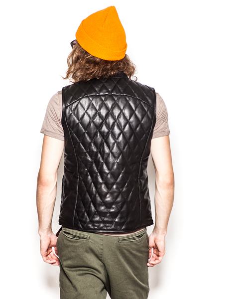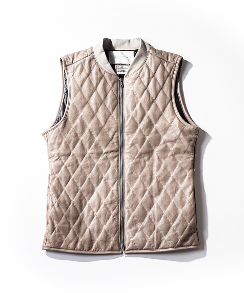 | Detail | 衿には小振りでシャープなリブ衿を配置した、非常にシンプルなデザイン。ファスナーにはTALON社製の物を使用。裏地には極僅かに目立つ迷彩柄の滑りの良いポリエステル生地を使用している。脇にはシームに合わせてポケットを配置。左身頃には内ポケットが付く。ライトな着用感なのでアウターにも、インナーとしても使用できる万能的なベスト。 |