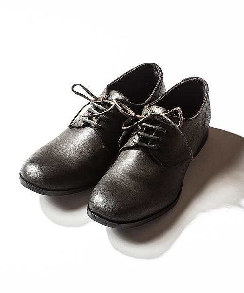 | Detail | デストロイレザーにて製作したプレーントウタイプの短靴。つま先は若干そり立っており、マッケイ製法を生かして極力コバはスマートの設定。紐には革タイプ、ろう引きタイプの2種類を付属として用意。経年変化によって革の表情の変化を十分に楽しむ事のできる1足。 |