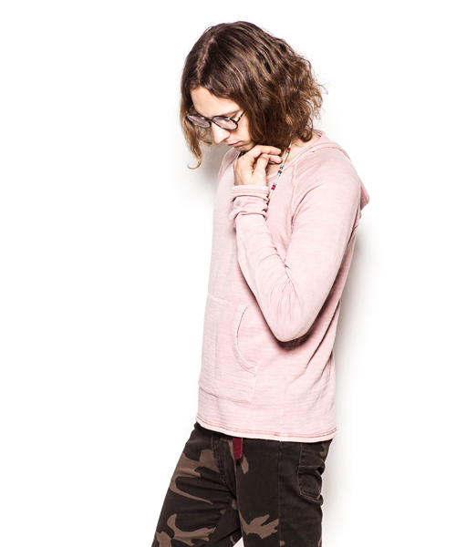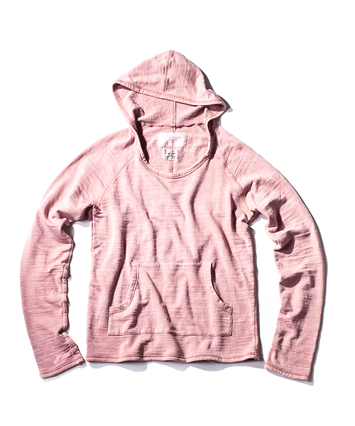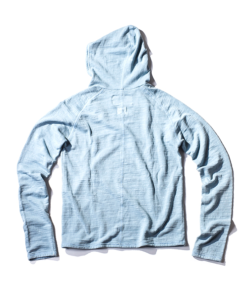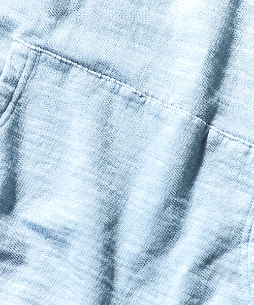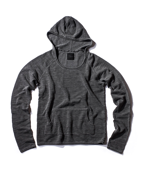 | Detail | 裏毛素材のフード付きカットソー。ポケット上部の縫製部分には切り替え生成り色の糸による手縫いによるハシゴステッチが入る。独特なフード付けが特徴な1枚。縫製後、ヴィンテージ感を出す特殊なUSED製品染めを施している。スラブのある生地感なのでより製品染めのムラ感が表現されている。染め後、フロントにはナンバリングをかすれプリントにて配置。生地感、加工感の映える1着。 |