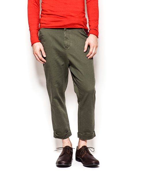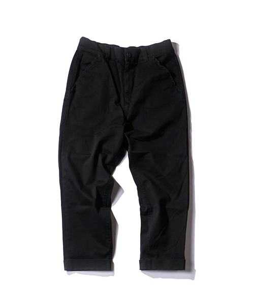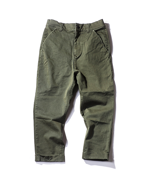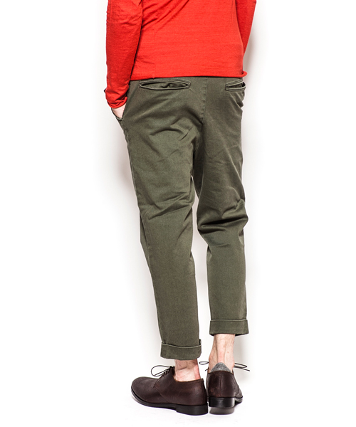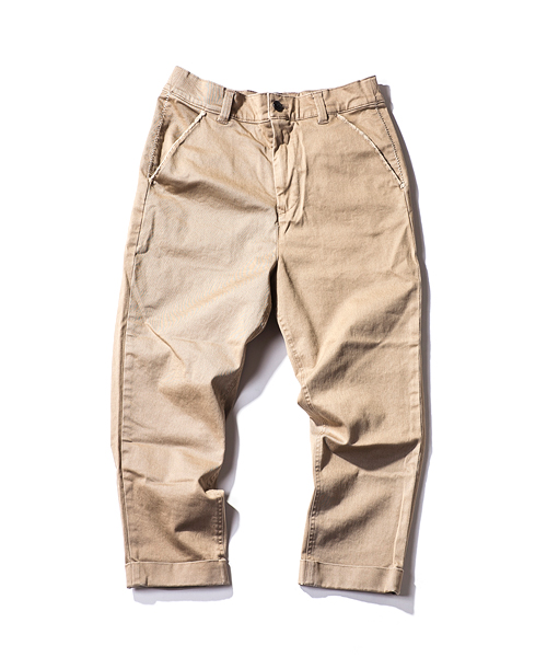 | Detail | アンクル丈のチノストレッチ生地を使用したパンツ。ファスナーにはTALON社製の物を使用。釦には水牛釦を使用。ウエスト後ろ半分はすべてゴムベルト仕様。若干股が深く腰回りにゆとりがあり、裾に向かって綺麗にテーパードしていくシルエット。裾はダブルに仕上げている。脇ポケット付近の脇シームには同色のハシゴステッチを施している。縫製後、バイオボールウォッシュ加工を施す事でクラシックチノの素材感をより一層高めた1本。 |