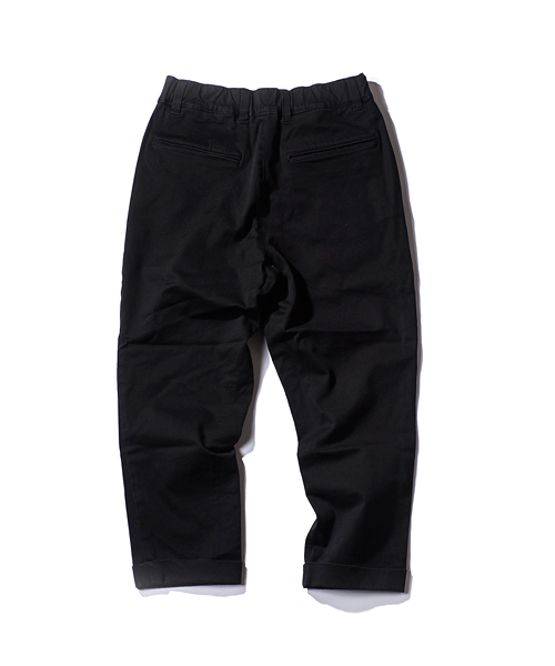| Material | コンパクトチノストレッチ:経糸にコンパクト糸を用いて織りあげてたチノストレッチ素材。コンパクト糸を使用している為、上品な表情のチノ素材に仕上がっている。ブラック、ネイビー色はムラの出ない染めで仕上げた生地、カーキ、ベージュ色はムラ感の出る染めで仕上げた生地にて使い分けている。 |