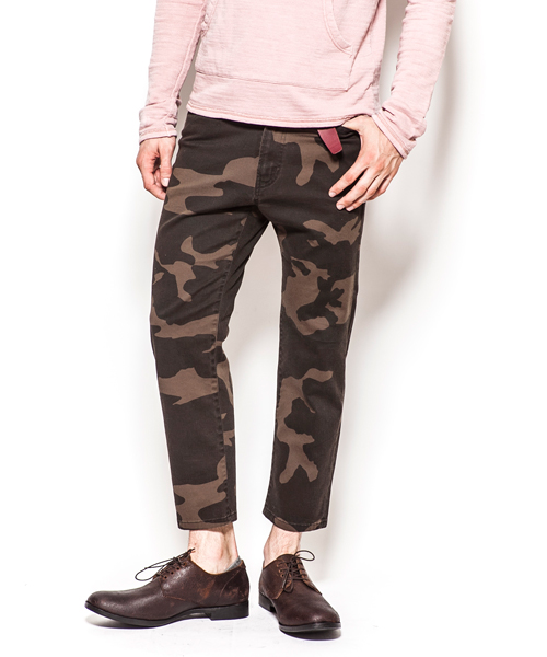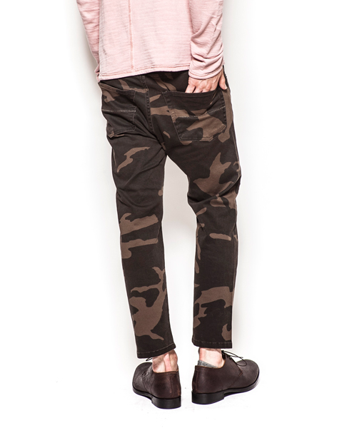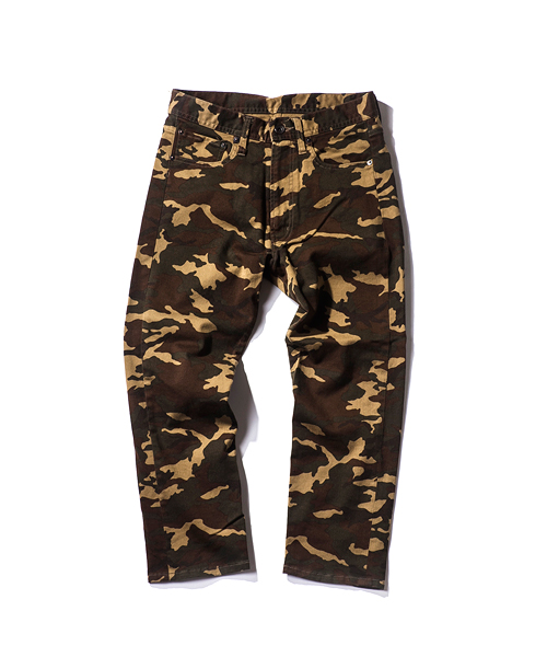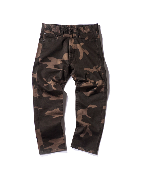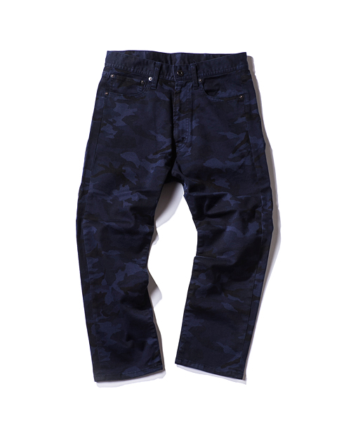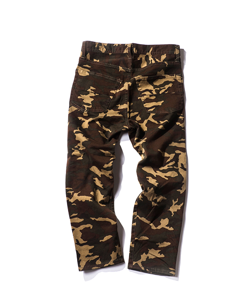 | Detail | カモプリントのツイル生地を使用したアンクル丈パンツ。TALON社製のファスナー、釦には水牛釦を使用。ベーシックな5ポケット仕様で、後ろパッチポケット口にはリベットを打ちこんでいる。縫製後バイオボールウォッシュ加工を施し適度なアタリ感、生地の加工感を追加。後ろパッチポケット中心には同色のハシゴステッチを施している。股上を若干眺めに設定し、裾に向かってテーパードさせたタイトシルエット。 |