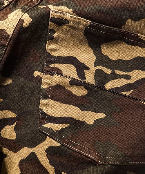 | Material | ストレッチツイル カモプリント:顔料染めにてカモプリントを施したストレッチツイル素材。顔料染めの為、自然な色落ち感を楽しむ事ができる。アメリカ、ザ・ダウ・ケミカルカンパニー社製の特殊スパンデックスを使用しており、従来のポリウレタンに比べ耐熱性・伸長回復率に優れている。 |