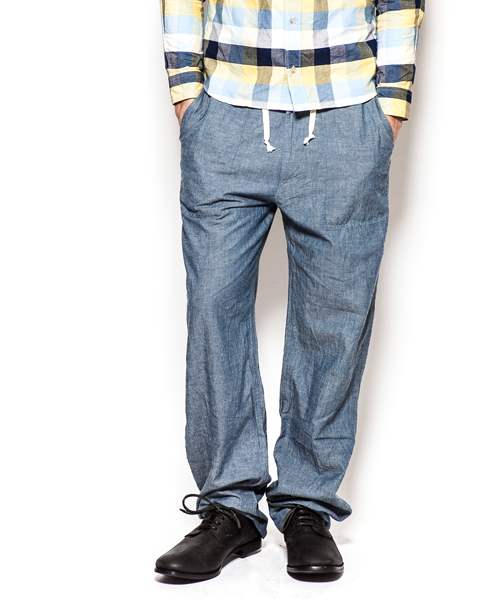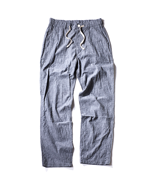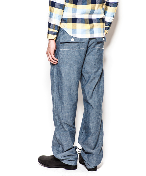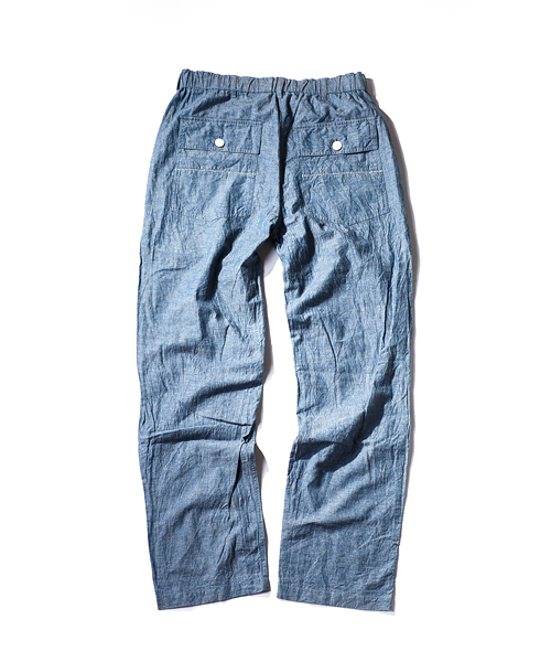 | Detail | ウエストがゴムとドローコード仕様のイージーパンツ仕様のベイカーパンツ。ファスナーにはTALON社製の物、釦には水牛釦を使用している。バックポケットの中心には太番手による生成り色のハシゴステッチを施している。裾に向かって若干テーパードさせた綺麗なワイドシルエット。縫製後ワンウォッシュを施している為、シャンブレーの生地感をより風合い良く仕上げている。 |