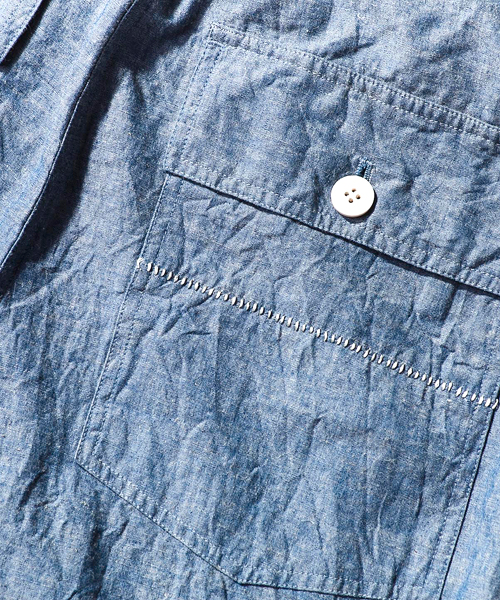 | Material | ヴィンテージシャンブレー:打ち込み良く、密度を高く織り上げて仕上げたシャンブレー生地。キバタをワッシャーして仕上げているのでナチュラルなヴィンテージライクな風合いが特徴。密度感がある為ハリとコシがある。今回はインディゴ色にはコットンリネン、ブラック色にはコットン素材にて使い分けている。 |