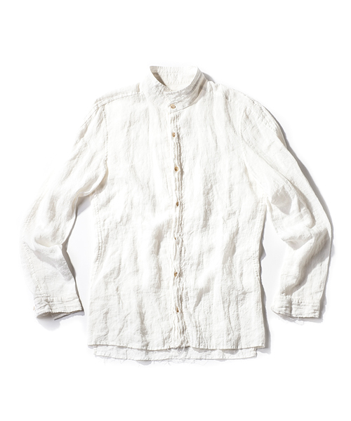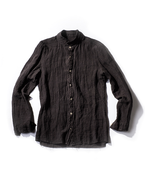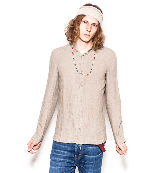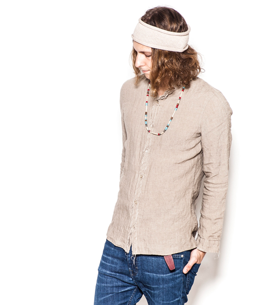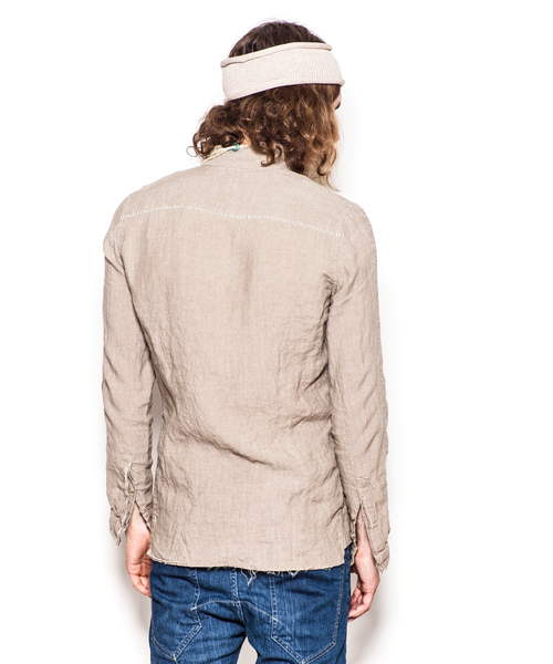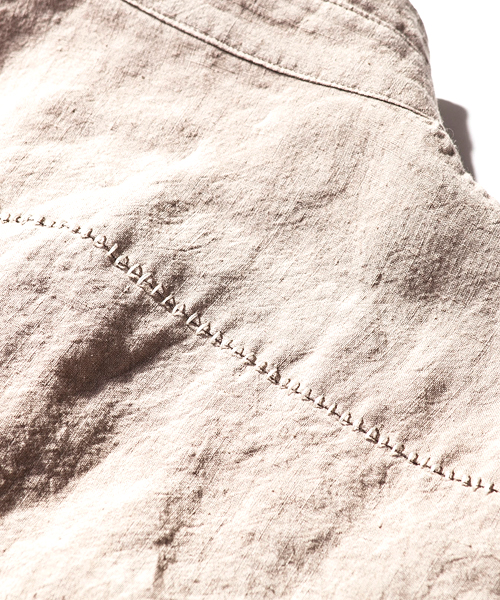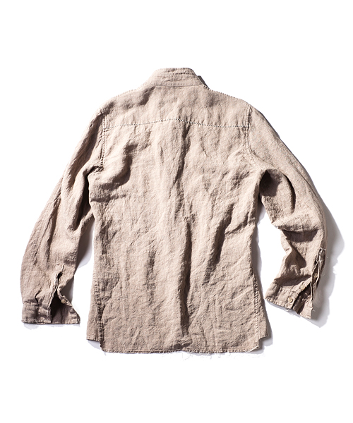 | Detail | 釦にはACANTHUS刻印入りのオリジナル釦を使用。肩には三角形の切り替えを配置。第3、第4釦には表裏にボタンが付き、おがみ合わせで釦を閉める事も可能な仕様。おがみ合わせにすることで、よりラフな着こなしを楽しむ事ができる。リネン生地を使用し、随所に切りっぱなし箇所を配置したデザインのウイングカラー仕立てのシャツ。後ろヨーク切り替えには生成り色の糸を使用したハシゴステッチを施している。縫製後ワンウォッシュを施している為天然染めの素材がより一層引き立つ仕上がりとなっている。 |
