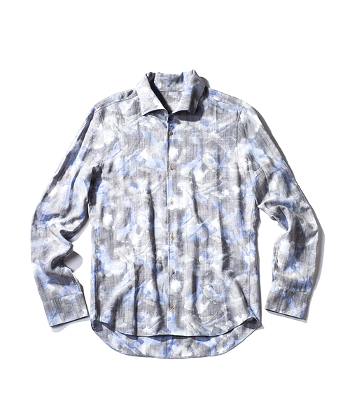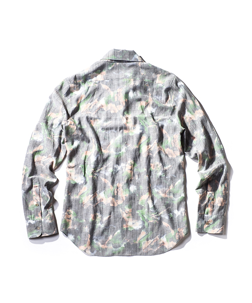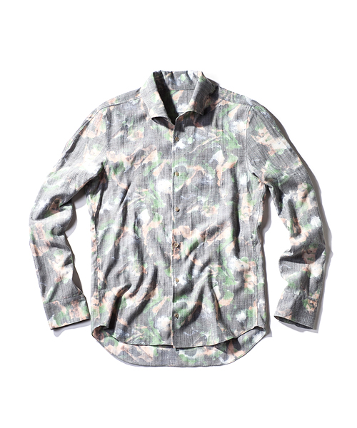 | Detail | 涼しげなブッチャー素材を使用したワイドスプレットカラーシャツ。衿は隠し釦を配置した比翼B.D仕様。ボタンにはACANTHUS刻印の入ったオリジナルボタンを使用。後ろヨーク切り替えには生成り色の糸を使用したハシゴステッチを施している。全体的にステッチをなるべく少なくし、シンプルな仕様で上品に仕立てた1枚。 |