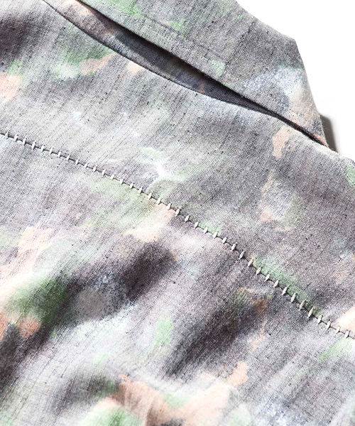 | Material | バンブーブッチャーフラワーカモプリント:バンブー(竹)、ポリエステル、コットンを組み合わせたブッチャー素材。太糸や細糸を用いて平織と斜子(ななこ) 織を不規則に組み合わせた織物。手ざわりは粗剛で通気性に富んでいる。その素材にフラワーカモプリントを施した特殊な素材。 |