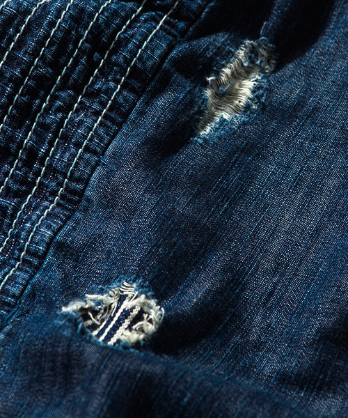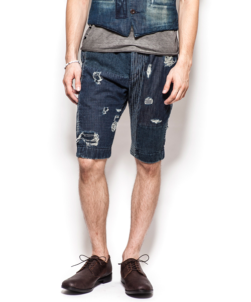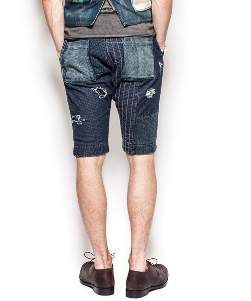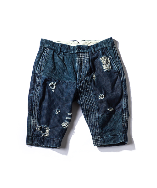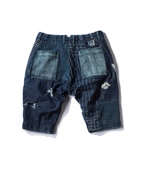 | Detail | 股上にゆとりをもたせつつ裾に向かってテーパードしたシルエットのショートショートパンツ。ワンウオッシュ後、天日干しする事で、パッカリングによる味を出している。刺し子等の手刺繍と折り重なった番手の違う糸でのパッチワーク等、ステッチワーク、加工に富んだ一本。 |