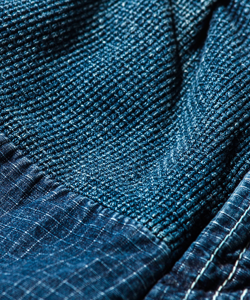 | Material | 襤褸:ちりあくた、うち捨て去られたもの、という意味。木綿が貴重な時代、どんな小さな切れでも、丹念に繕いして、布を重ねていって、厚くなった敷物もある。ツギに使う布は 一時代前の布を使うこともあるので、非常に古い生地であったりする。このパンツには、柔道着に使用される刺し子、藍染めのデニム、ワッフル等様々な生地が使用されている。手つむぎ・手織り、自然の染めの布だけが持つ色合い、風合いが魅力。 |
