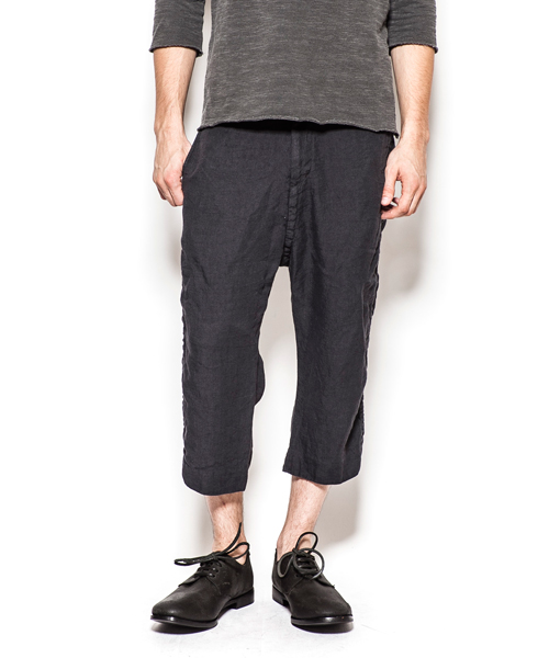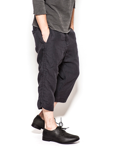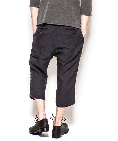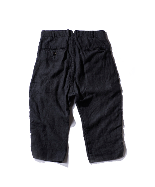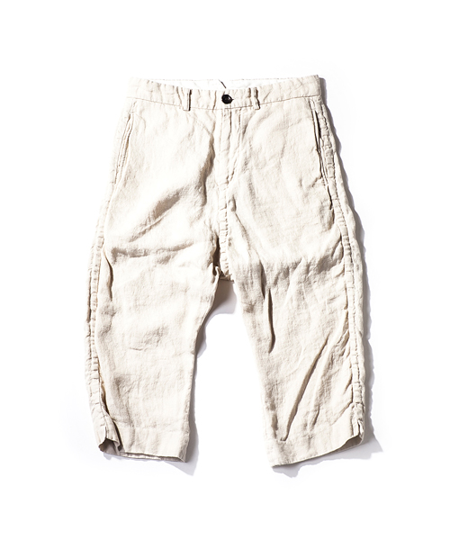 | Detail | 股上によとりをもたせつつ、股下のカーブを調整し程よくルーズなシルエットの八分丈のリネンパンツ。ワンウオッシュ後、天日干しする事で、パッカリングを出している。リラックス感の漂う1本。 |