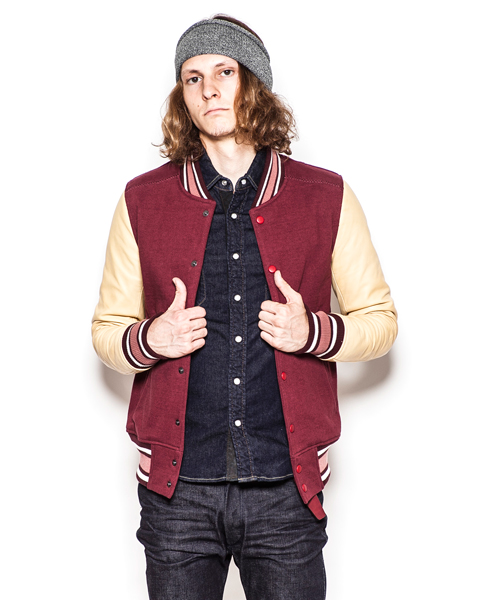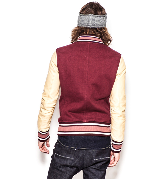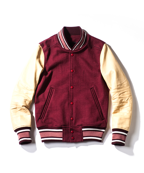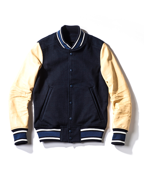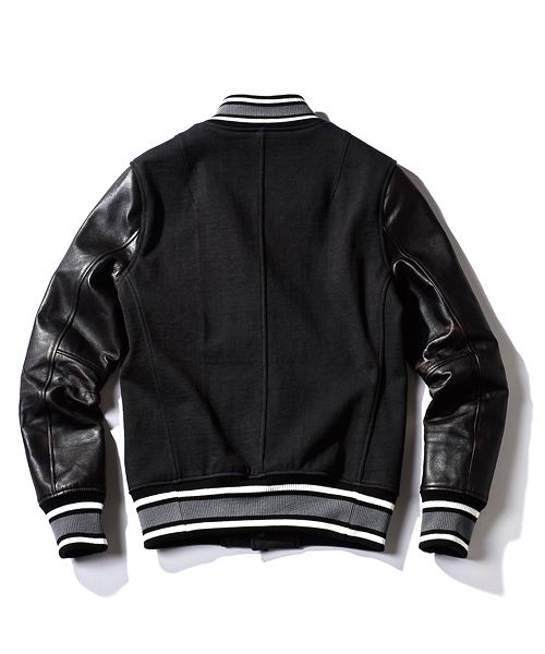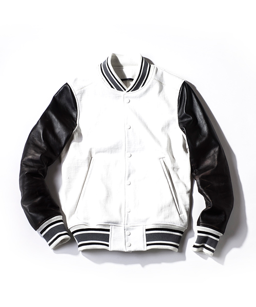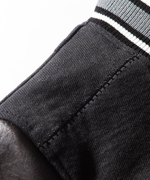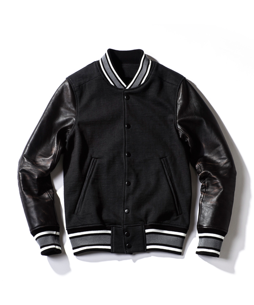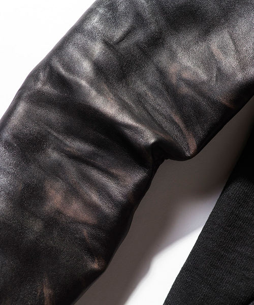 | Detail | 身頃には吊天竺、袖にはベジタブルラムレザーを使用したスタジアムジャケット。ドット釦は同色系のレザーでくるんだくるみドット釦をオリジナルで製作して使用。袖には3Dシワ加工を施しナチュラルな仕様感を表現。black色、white色の袖レザーにはアドバンレザー(下地の色と表面の染め色の異なるレザー)を使用し、職人による下地の色を浮き出させるused加工を施している。袖のリブもオリジナルで編み立てたライン入りリブを使用。身頃は一枚仕立て、袖裏にはダーク迷彩の裏地を使用している。肩の縫い目には0番手の極太糸にて職人の手作業によるハシゴステッチを施している。細部の仕様にも拘ったスタジアムジャケット。 |