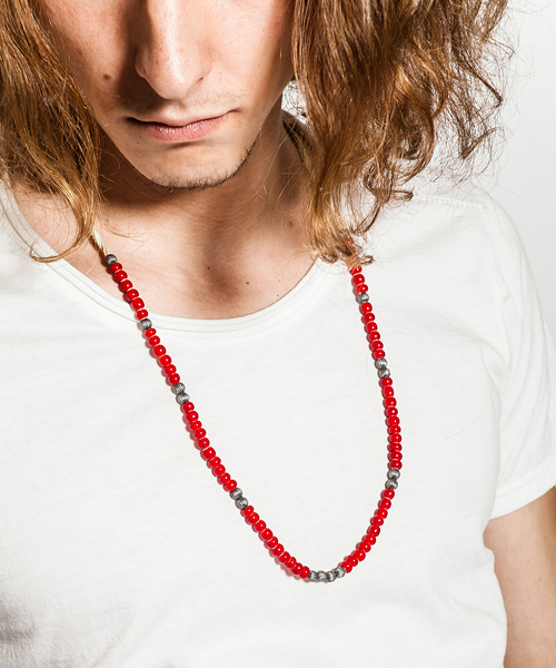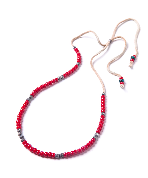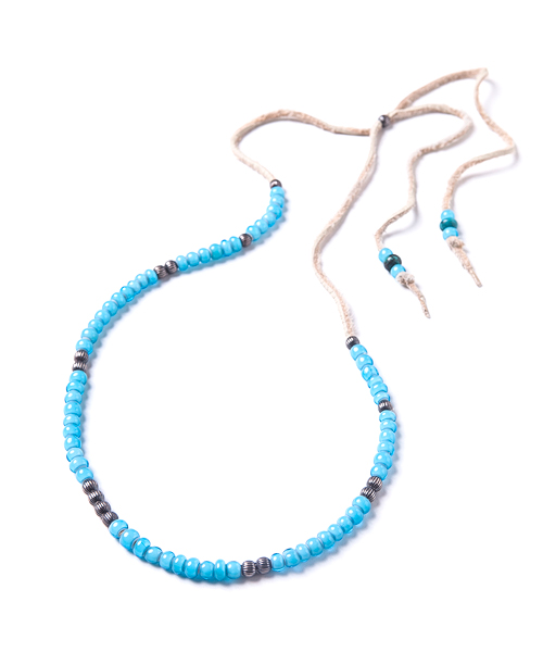 今回のネックレスには、加工を施したシルバービーズ、ターコイズビーズを使用。紐にはDeer(鹿)の鹿紐を使用している。TOPパーツも自分の好みで付け替える事が可能。