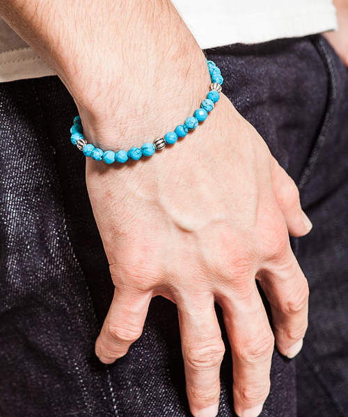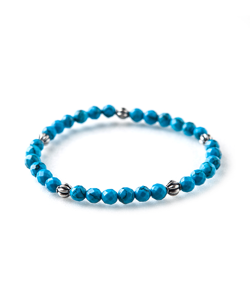 別名「トルコ石」。由来は、エジプトからトルコ経由で地中海方面へと運ばれたと云われている。6mm64面カットを施しており、ブルーの中にも違った輝きを見せることができ、薄着の季節に重ね付けして楽しめるアイテム。