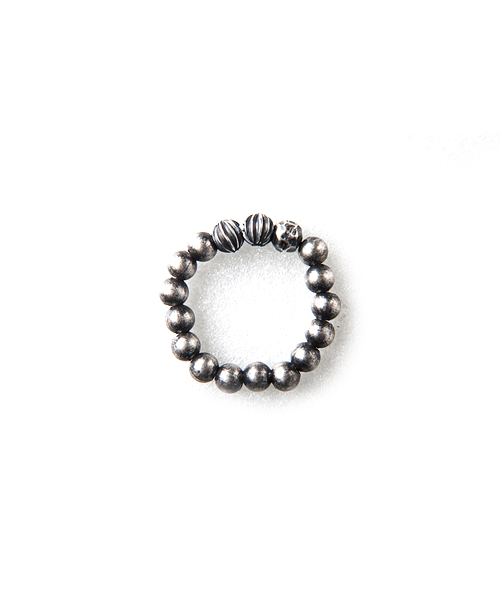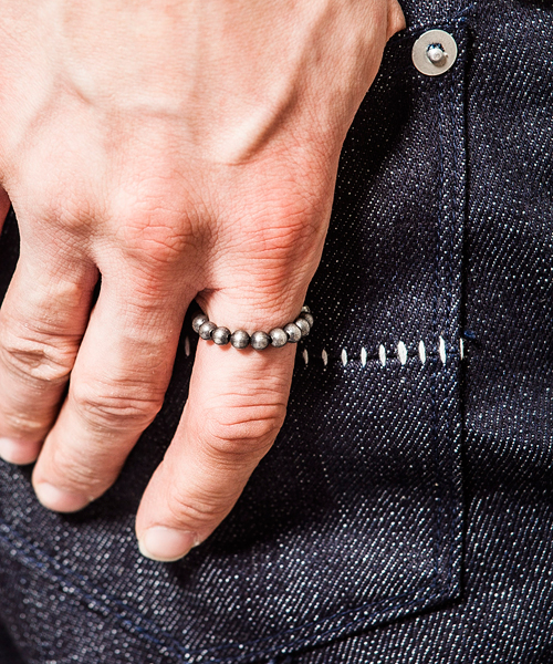 シルバーデザインビーズを使用し、いぶし加工を入れることにより、マットな風合いを演出している。3サイズ展開で重ね付けや、違う指に付けたりと多種多様に楽しめるアイテム。