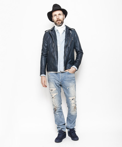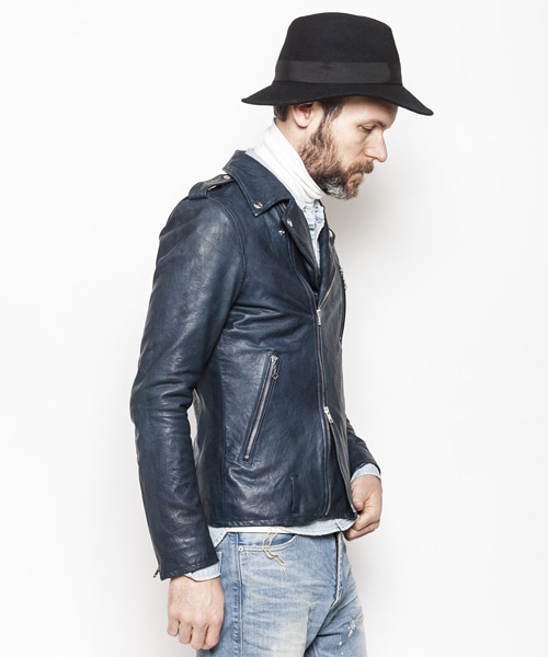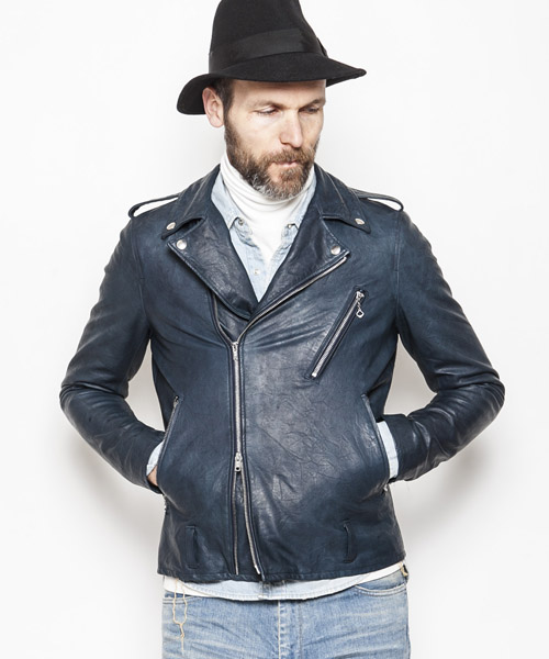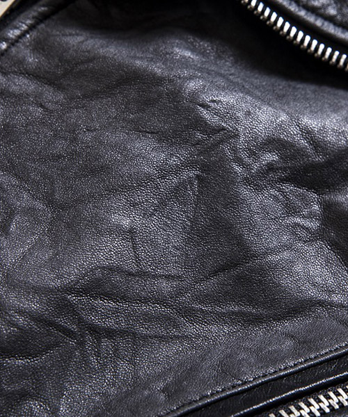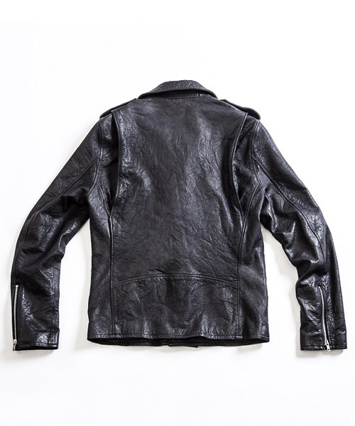 | Spec | ベジタブルラムを使用したダブルライダースジャケット。身頃裏には迷彩パターンの6/4クロス、袖裏には袖通りの良い上質なキュプラ生地を使用。ファスナーにはTALONファスナーを使用。単に水洗いではなく、ワックス・オイル・その他数種類のケミカルを配合した溶剤で洗い加工を施す。その後円心脱水機で脱水し、スチームドラムで熱を加えながらドラミング加工を施す。手作業でオイルを丹念に入れた後、バーナーでオイルを押し込み、染料又は顔料にワックス・オイルと溶剤を職人の感覚をたよりに調合したものを、1ずつハンドメイドで塗布していき、ハンギングにて自然乾燥をする。それによってベジタブルラムの表情を最大限に生かした独特のナチュラルな加工感を生み出いている。 |