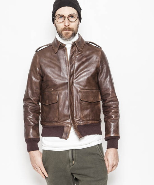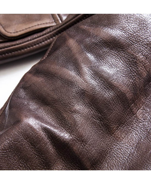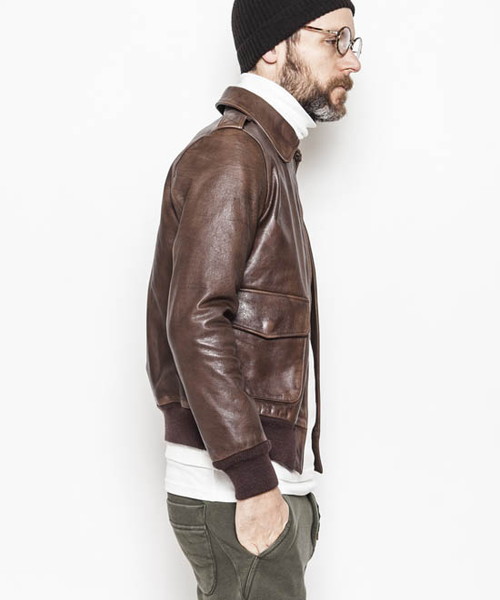 | Spec | 毎シーズン1型ずつを目途に展開していくACANTHUS内のvintageを意識したラインである"TypeVintages"の第二弾。デザインソースは大戦時のA-2納入メーカーの中でも、代表的なRough Wear社のA-2。武骨なフォルムは多くのA-2ファンを生み、中でも1943年コントラク/27752モデルは大戦を代表するA-2と云って過言でない。サイズとフィット感、一部の仕様は現代的に再構築している。ファスナーにはTALON社製の物を使用。リブにはオリジナルで編み立てた別注リブを採用。身頃裏地にはヴィンテージ調のウール生地を使用。袖裏には袖通りの良い上質なキュプラ生地を使用している。革に厚みがあり、細かいディティールが多い為縫製時には縫い易くする為革の縫い代を薄く漉く作業が必要になる。漉き機自体今の時代では希少な物であり、これを扱って縫製をこなす職人は数少なく、このA-2も社内で唯一漉き機の扱いと、縫製が可能な職人の手によって仕上げられている。 縫製後には革に水分を含ませ、ドラミング加工を施している。この加工によって、革の加工感、光沢感、vinatage感が増しベジタブル鞣しによる革の表情を最大限に引き出す事ができる。さらにACANTHUSオリジナルの袖の3D加工を加えて、全体的に手作業にて色を落としていく加工を施している。色を落とす作業は1発勝負で修正がきかない為、感性が非常に高い職人が一枚一枚丁寧に色を落としていく。色を落とした後は全体のトーンを落ち着かせる為に薄い黒色の染料を塗布していく。縫製~加工まで非常に手間のかかる工程の為仕上げる事ができるのは1週間に1着が限度である。その他にも多くの細かい工程を施す事で出来上がる1着。大量生産のできない特別なA-2ジャケット。 |