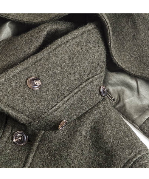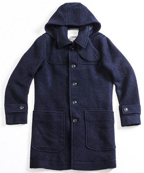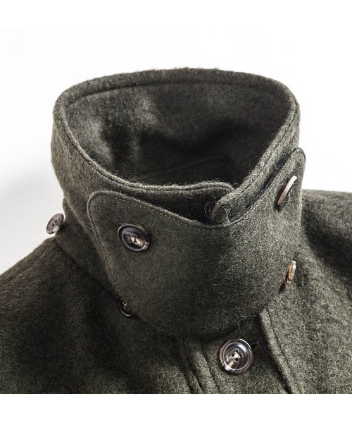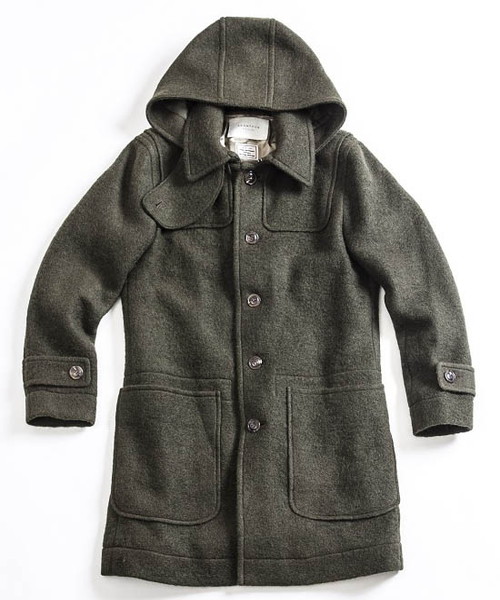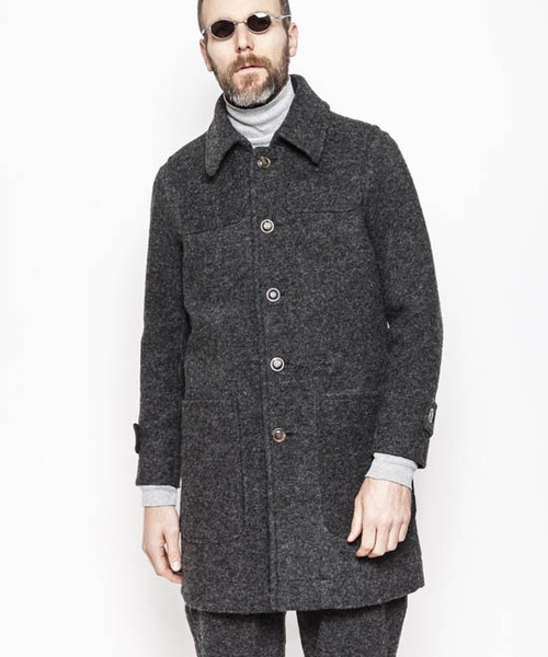 | Spec | かつて漁師たちが使用していた防寒用コートのフィッシャーマンコートを軽く、保温性に優れたスライバーニット生地にて製作した1着。起源は北欧の漁師の仕事着であるが、第二次世界大戦時にイギリス海軍で防寒着として広く使用され、その余剰在庫品が大戦後に市場に出回ったことで一般化したダッフルコートのフロント仕様を釦明きに変更したデザイン。裏地上部と袖には表地の色とカラーマッチに優れた色味の肌滑りに優れたキュプラ生地を使用。フード裏、身頃下部には同色系の別生地にて切り替えている。フードは取り外し可能。衿元にはチンストラップを配置している。外套(オーバーコート)設定の為、中に着込む事のできるサイジング。上品な雰囲気でオーセンティックに使用できるコート。 |