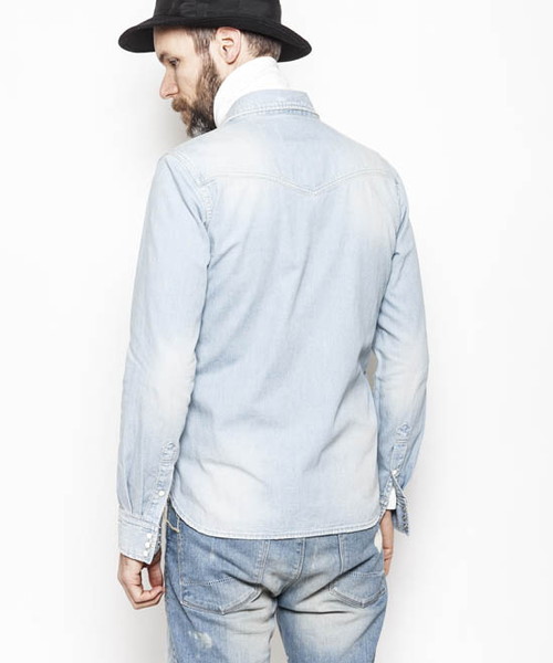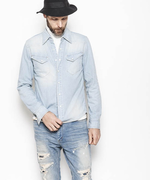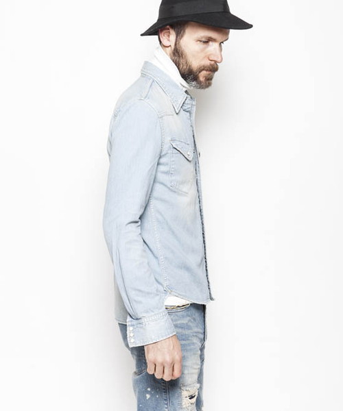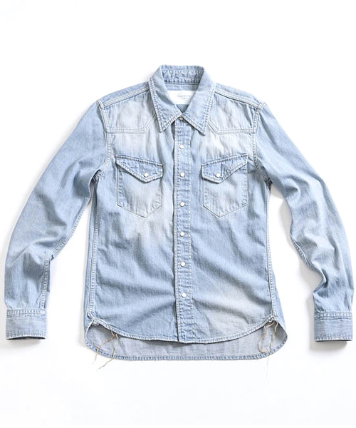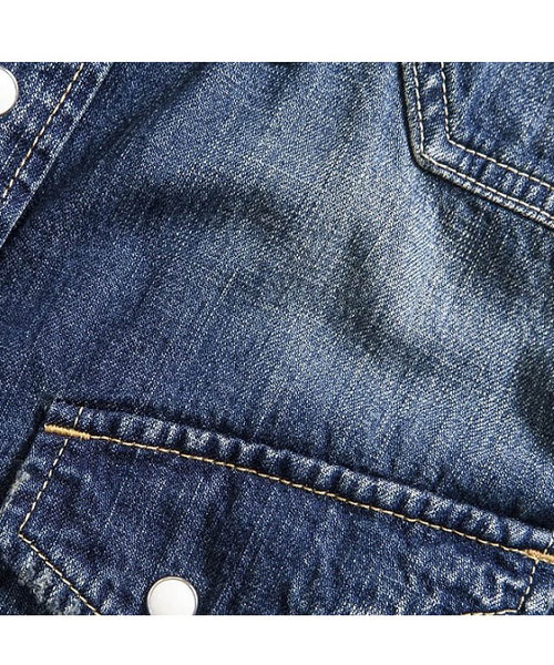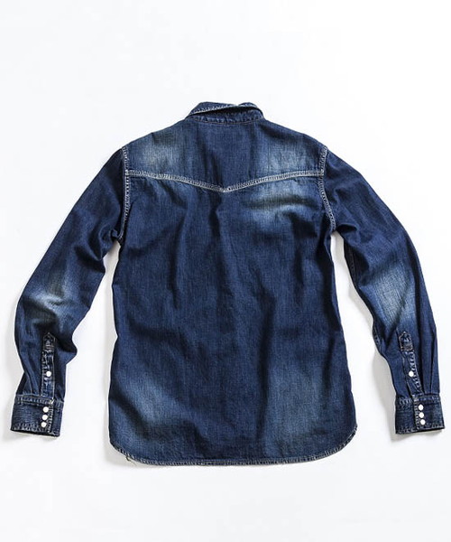 | Spec | 8ozのデニムを使用したウエスタンシャツ。チェーンステッチの仕様に加え、細部によって異なる番手、色の糸で縫製をする事で、加工による表情を変化させている。裾脇にはチェーンステッチを流した仕様。釦にはパールタイプのベルナップ釦を使用している。世界トップクラスのデニム加工技術を有する岡山児島でダメージとリペア加工まで施し、リアルヴィンテージを追及した一枚。 |