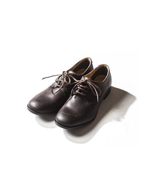 | Spec | デストロイレザーにて製作したプレーントウタイプの短靴。つま先は若干そり立っており、マッケイ製法を生かして極力コバはスマートの設定。紐には革タイプ、ろう引きタイプの2種類を付属として用意。経年変化によって革の表情の変化を十分に楽しむ事のできる1足。 |