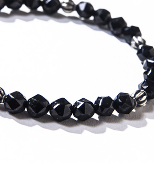 ブラックダイヤモンドに匹敵する程の輝きを放つとして重宝されているブラックスピネルを使用。特に光の反射率が高く他の天然石とは輝き方が異なる。シンプルなブレスレットタイプにデザイン。16㎝と18㎝のタイプを用意。伸縮性のある糸を使用している為、着用し易い仕様となっている。