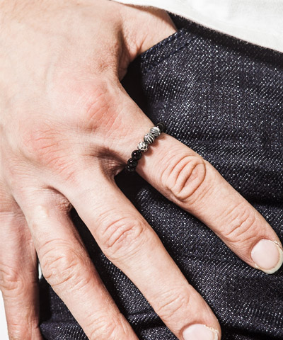 | Spec | シルバーデザインビーズを使用し、いぶし加工を入れることにより、マットな風合いを演出している。シルバーとの相性が良いオニキスを使用することで、デザイン性をプラス。魔除けとして使用されるオニキスを使用。15号、17号、19号の3サイズ展開。伸縮性のある糸を使用している為、着用し易い仕様となっている。 |