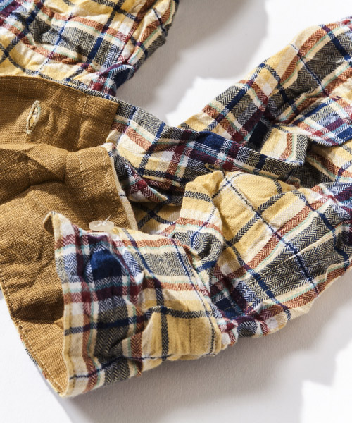 | Material | シャーリングチェック。好配色なシャーリングチェック生地。ヘリンボンの上品な組織とシャーリングのシワ感が特徴。肌触りの良い柔らかな素材感と軽やかな表情を持つ上質な国産のチェック生地。 |