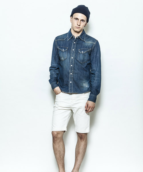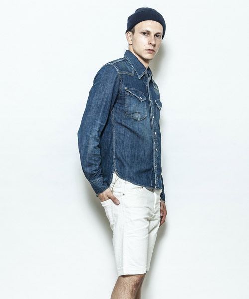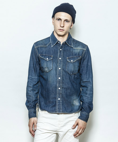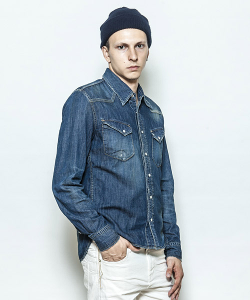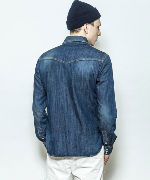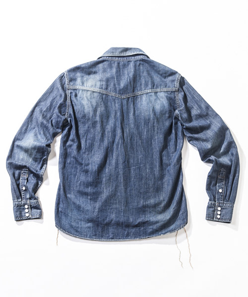 | Spec | 5ozのデニムを使用したウエスタンシャツ。チェーンステッチの仕様に加え、細部によって異なる番手、色の糸で縫製をする事で、加工による表情を変化させている。裾脇にはチェーンステッチを流した仕様。釦にはパールタイプのベルナップ釦を使用している。世界トップクラスの加工技術のある岡山児島でダメージとリペア加工まで施し、リアルヴィンテージを追及した一枚。 |