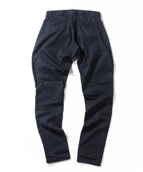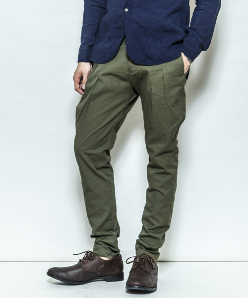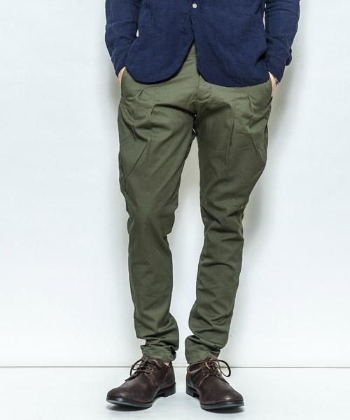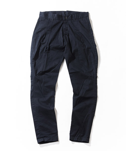 | Spec | 薄手のバーバリー生地を使用したタックパンツ。前に2本タックをとる事で、腰~もも回りにかけて綺麗に膨らみを持たせ、裾に向かって絞っていくセミジョッパーズ風のシルエット。膝脇にもダーツをとる事で立体的で動き易い美しいシルエットとなっている。縫製後ワンウォッシュ加工を施す事で全体の風合いを向上。釦には水牛釦を使用している。独特で美しいシルエットを実現したタックパンツ。 |