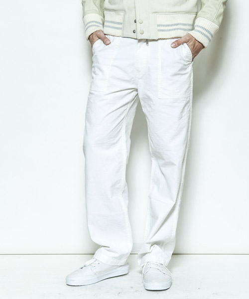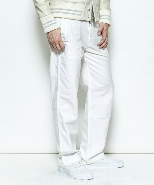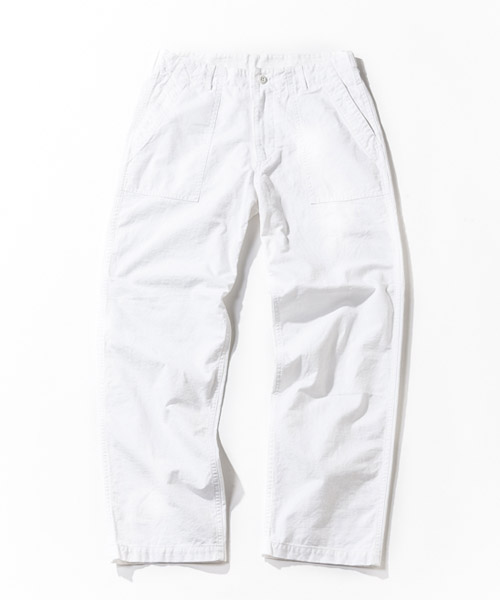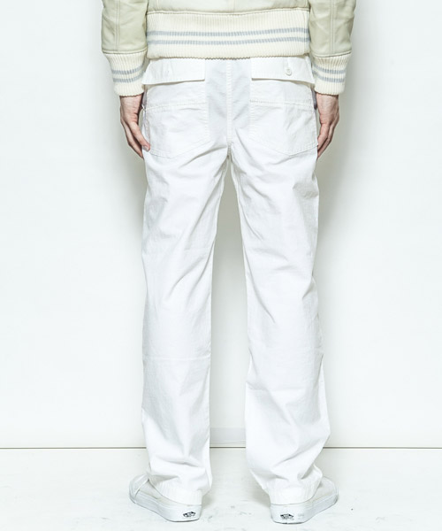 | Spec | アメリカ軍の基地にて働く人の為に生まれたファティーグパンツをモチーフに製作した1本。ファスナーにはTALON社製の物を使用し、後ろパッチポケットの中心には職人によるハシゴステッチが施されている。シルエットはファティーグパンツの特徴でもある太めのシルエット。縫製後ストーンバイオウォッシュをかける事で生地感、加工感に深みを持たせている。履き込む事で味わいの増していく1本。 |