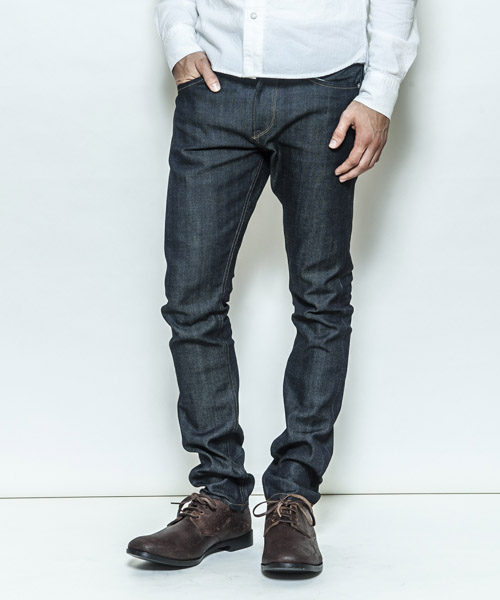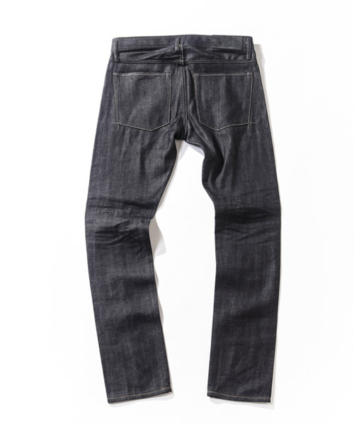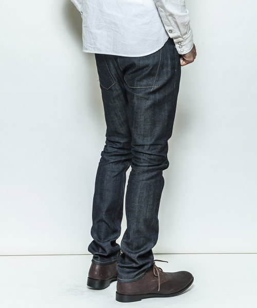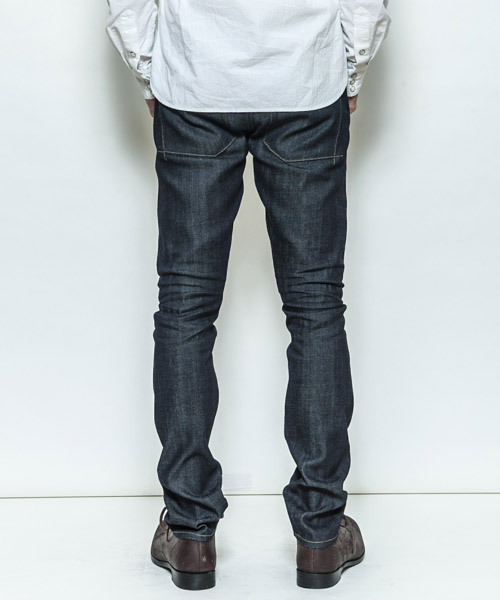 | Material | セルヴィッチデニム。9.75ozのライトな耳付きセルヴィッチデニム。綿は米綿、経糸に5,7/1の珍しい太さのムラ糸を使用し、横糸には7/1のムラ糸を使用。シャトル織機でローテーションに織られた耳付きセルビッチデニム。糸の緩みがタテ落ち感に味を加えるデニム生地。 |