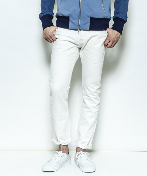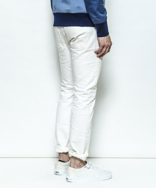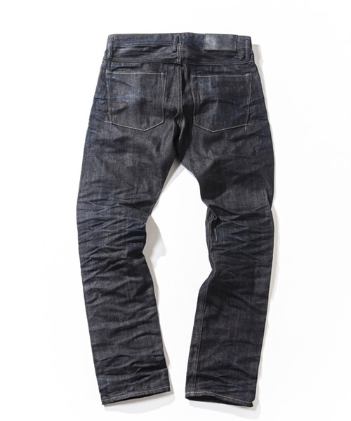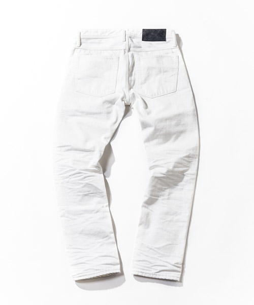 | Spec | ストレッチデニムを使用した5ポケットタイプの綺麗なストレートシルエット。釦には"ARTISAN SOUL"ロゴ入りのオリジナルタック釦を使用。前明きタック釦仕様となっている。革パッチにはベルギー産のブライドルレザーを贅沢に配置。縫製後、半年ほど履き込んだような立体的なシワ加工と削りを施している。 |