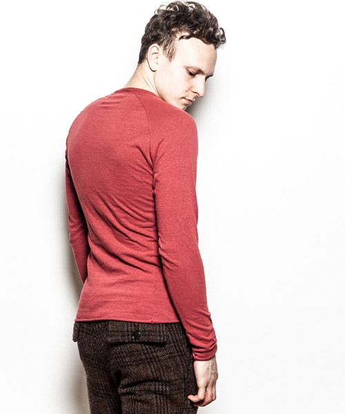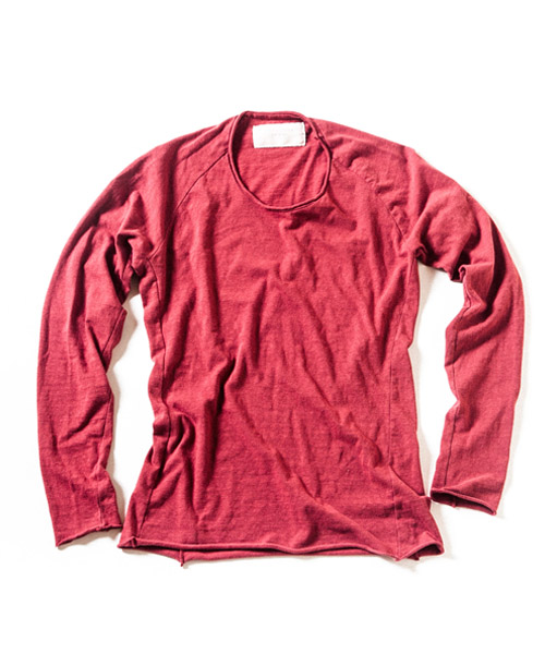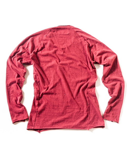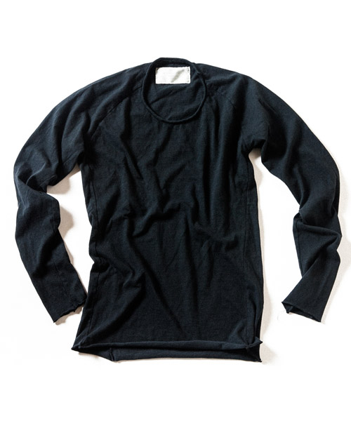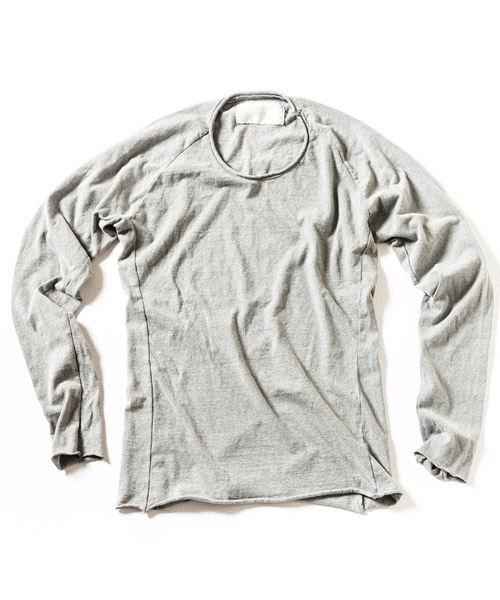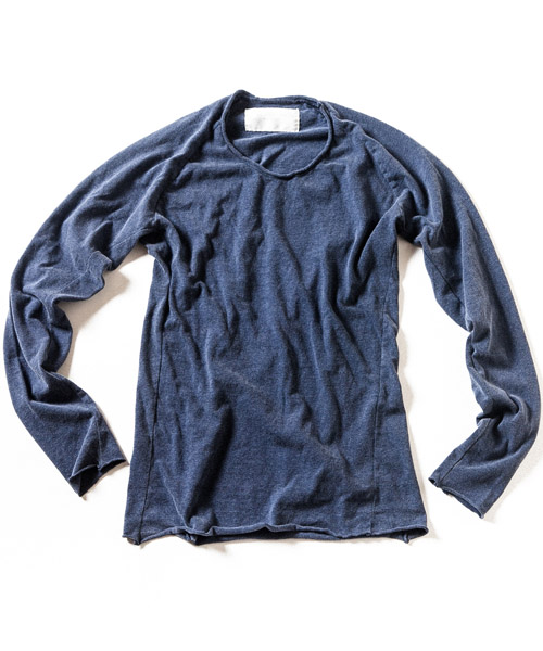 | Material | ラフィー 天竺。生地の製造工程での落綿を80%以上使用し、紡績のスピードを落とし丁寧に紡出する事で柔らかい風合いに仕上げた天竺生地。落綿使用による、荒々しさの中に柔らかさとしなやかさを持ち、そのムラ感は機械的には作れない絶妙な味を表現している。 |