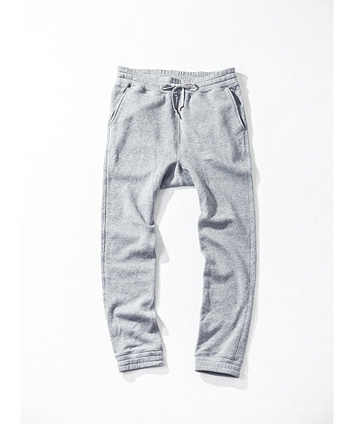 | Spec | 度詰め裏毛を使用し、イージーパンツ。ウエストはゴムと紐にて調節可能。両脇ポケット、パックには片玉縁ポケットを配置。股にはフライスによるマチ切り替えを配置し、動き易さを向上させている。裾はゴム入れ絞ったリブ仕様。若干テーパードさせた綺麗なシルエットのスウェットパンツ。 |