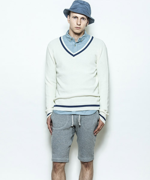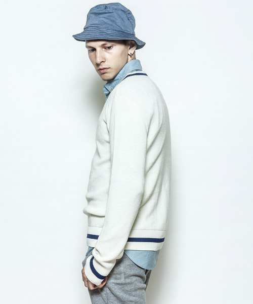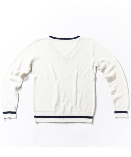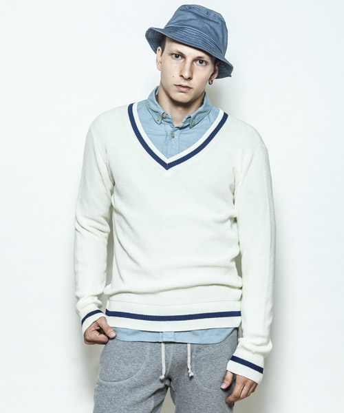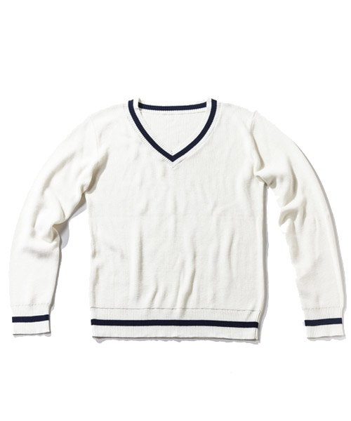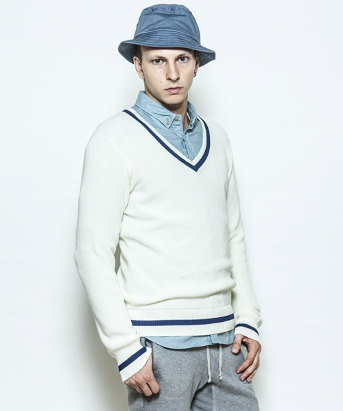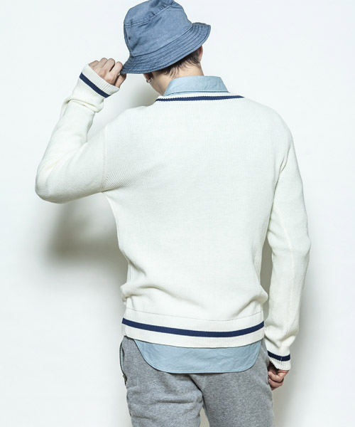 | Spec | 本来はケーブル編みで厚手のセーターだが、サマーニットとして上質で肌触りの良いコットンベースの糸で編み上げたセミゲージのチルデンセーター。アメリカのテニスの名選手、ウィリアム=チルデンの名にちなんでおり、Vネックの回りと裾(すそ)に1本ないし数本の太いストライプが入っているのが特徴。肩はドロップショルダー仕様、Vネックは少し深めの設定の為、様々なレイヤードを組み合わせる事が可能。品質の高いニット素材を使用し、タイト過ぎない綺麗なシルエットでシンプルに仕上げた上質で上品な1枚。 |