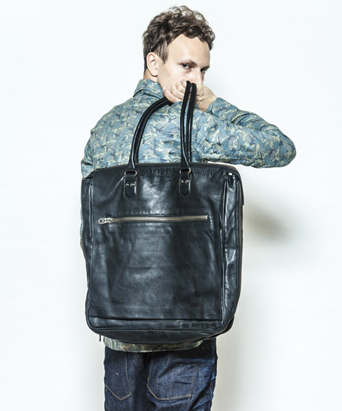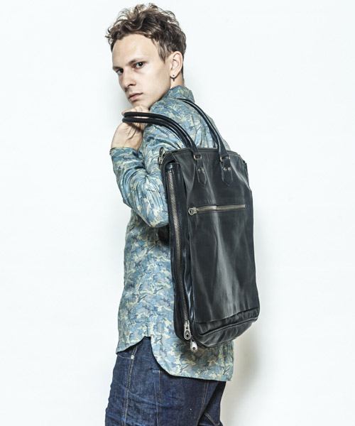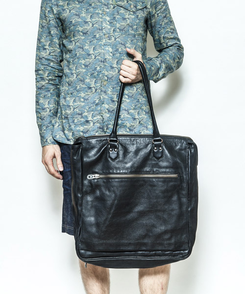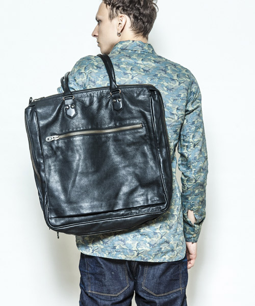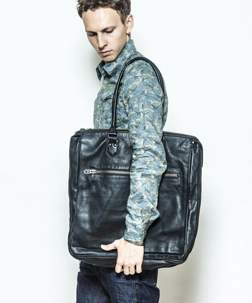 | Spec | 新型のトート型バッグ。大蓋を外すと中にもポケットを配置、本体周りに着くファスナーを開けるとマチが広がり鞄の容量を大きくする事が可能。裏地には身頃裏には迷彩パターンの6/4クロスを使用。ファスナーにはRACCAGNI社製の物を使用している。多機能な仕様を詰め込んだ上質なレザーバッグ。 |