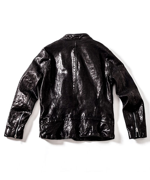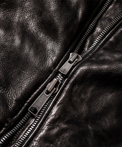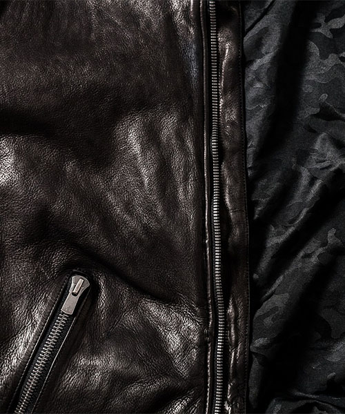 | spec | カーフという稀有な素材を大胆に製品染めした1着。マチ付きの袖口、衿タブ、重厚感のあるファスナー等ヴィンテージに見られるディティールをベースに、クラシックなアメリカンモーターサイクルのライダースジャケットをベースに製作。裏地にはポリエステルの迷彩ジャガード生地を採用。ファスナーにはハードな製品染め加工に耐えうる高品質なYKK EXCELLAファスナーを採用。オイルをたっぷりと浸透させて製品染めを施す事で滑らかな質感を実現している。製品染めでしか表現できない色味と素材感、革の価値を十分に体感する事のできる1着。 |