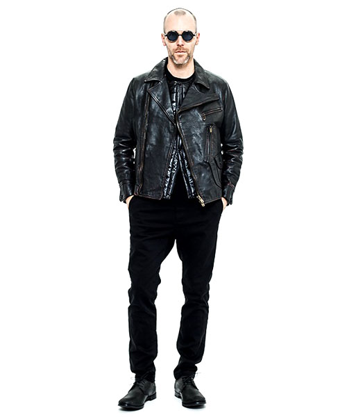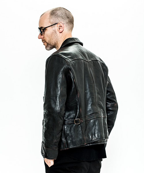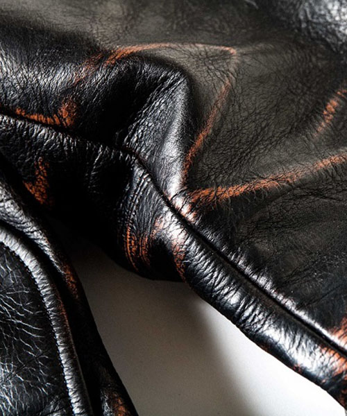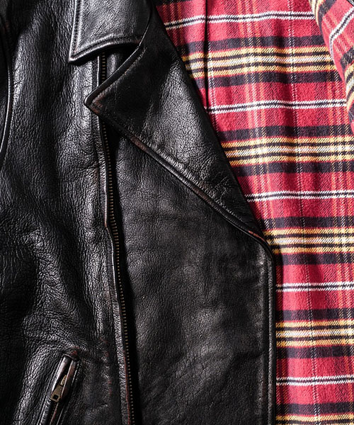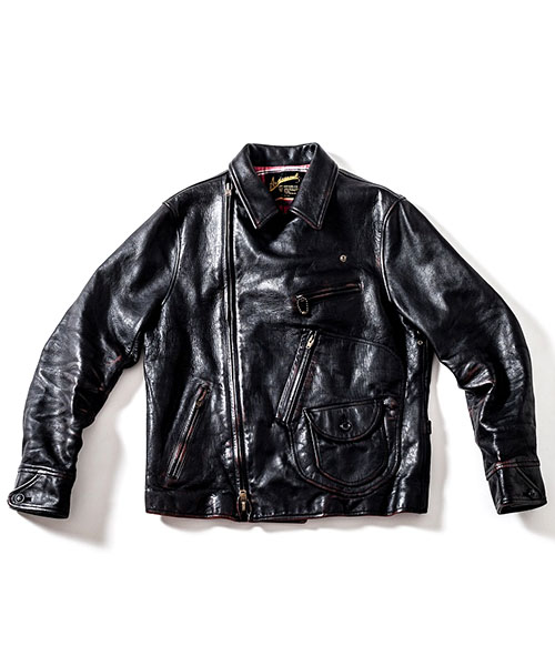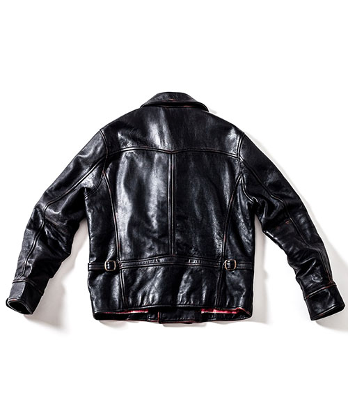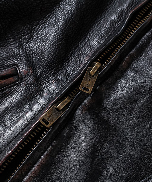 | spec | デザインソースは1930年代のA.T.Hendrick社のカスタムメイドのレザージャケット。特徴的な形の大きな襟、フロントの特殊な「D型ポケット」、背中の「アコーディオンプリーツ」等デザインはヴィンテージを意識しているが、サイズとフィット感は現代的に再構築している。ファスナーにはTALON社製の物を使用。身頃裏地には起毛加工を施したネル生地を贅沢に使用。袖裏には袖通りの良い上質なキュプラ生地を使用している。 |
