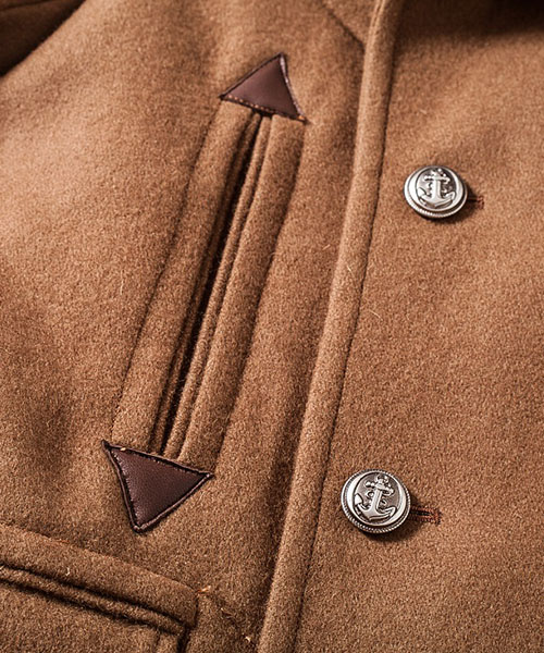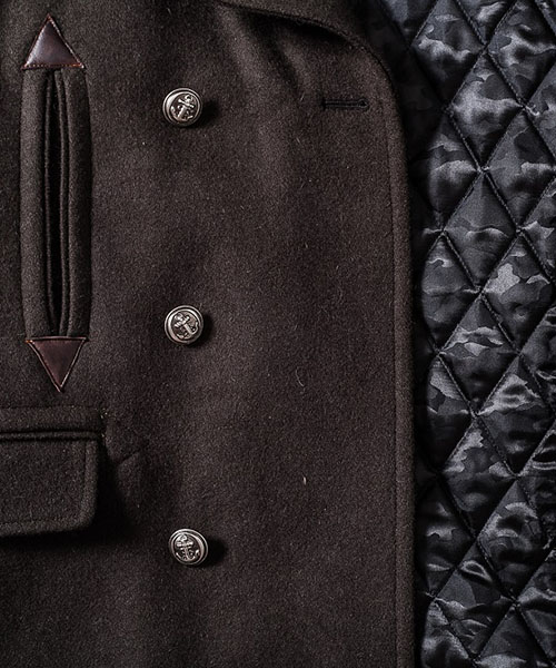 | spec | 身頃裏にはキルト加工を施した迷彩ジャガード生地、袖裏には中綿を挟んだ袖通りの良い上質なキュプラ生地、袋布には起毛生地を使用し保温性を高めている。釦にはフランス製のデットストックの物を使用。この釦を製作していた工場は、昔から軍物の付属類を製作していたが火事になってしまい現在は存在しない。特徴は、シルバー(ニッケル)のメッキが数種類を使用した方法で作られている。日本では、安全を考慮され、シルバー(ニッケル)のメッキが特定の物でしか作る事ができず現在この表情の釦を作る事はできない。よって同じクオリティの釦は作る事ができない貴重な釦。高めに設定した襟にはチンストラップも装備し、機能性も考慮。胸の両玉縁PK口には革の補強パッチを配置している。10's~20'sの100年以上前のPコートを参考に着丈を長く設定したパターンに全体を変更。vintageディティールを取り入れたオーセンティックな1着。 |